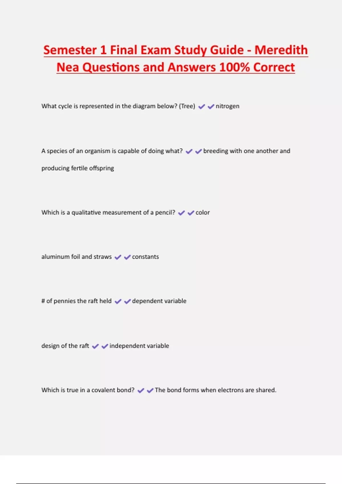 Semester 1 Final Exam Study Guide - Meredith Nea Questions and Answers 100% Correct What cycle is represented in the diagram below? (Tree) nitrogen A species of an organism is capable of doing what? breeding with one another and producing fertile offspring Which is a qualitative measurement of a pencil? color aluminum foil and straws constants
