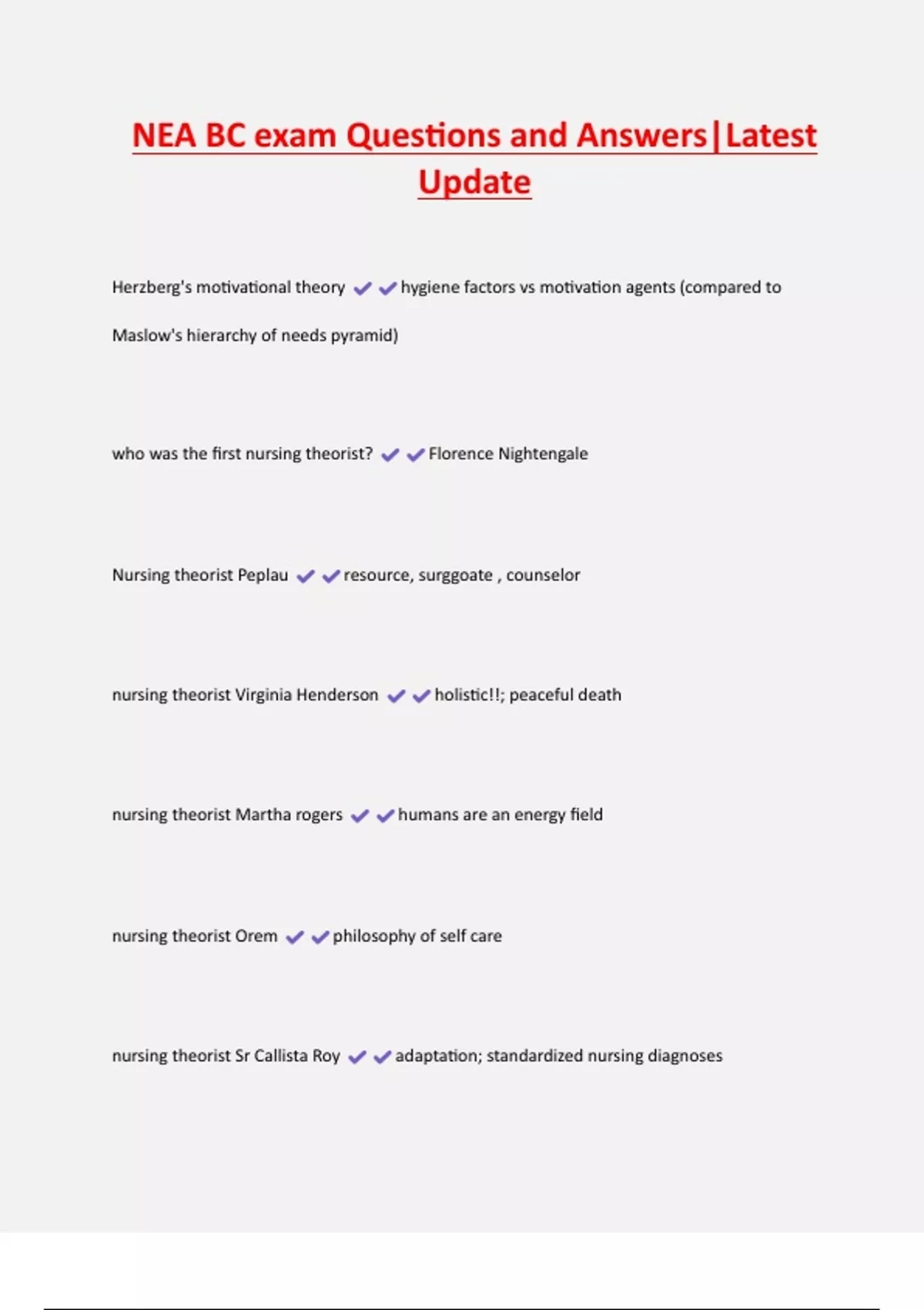 NEA BC exam Questions and Answers|Latest Update Herzberg's motivational theory hygiene factors vs motivation agents (compared to Maslow's hierarchy of needs pyramid) who was the first nursing theorist? Florence Nightengale Nursing theorist Peplau resource, surggoate , counselor nursing theorist Virginia Henderson holistic!!; peaceful death