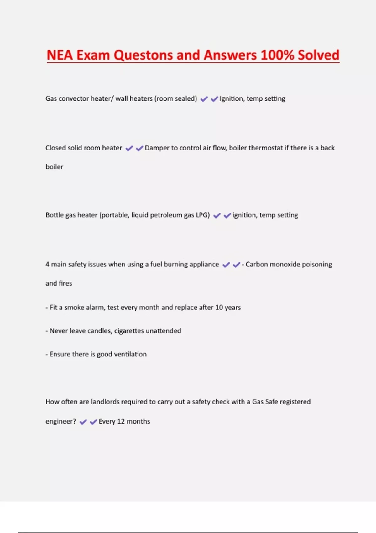 NEA Exam Questons and Answers 100% Solved Gas convector heater/ wall heaters (room sealed) Ignition, temp setting Closed solid room heater Damper to control air flow, boiler thermostat if there is a back boiler Bottle gas heater (portable, liquid petroleum gas LPG) ignition, temp setting