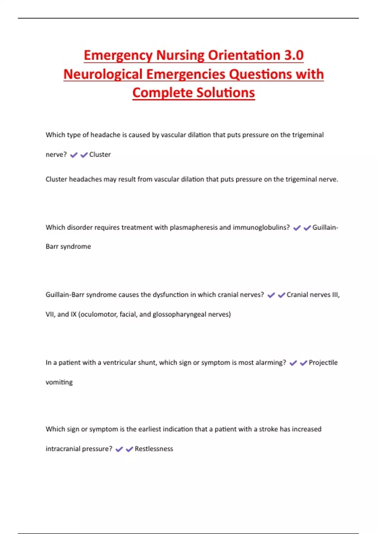 Emergency Nursing Orientation 3.0 Neurological Emergencies Questions with Complete Solutions Which type of headache is caused by vascular dilation that puts pressure on the trigeminal nerve? Cluster Cluster headaches may result from vascular dilation that puts pressure on the trigeminal nerve. Which disorder requires treatment with plasmapheresis and immunoglobulins? GuillainBarr syndrome Guillain-Barr syndrome causes the dysfunction in which cranial nerves? Cranial nerves III, VII, and IX (oculomotor, facial, and glossopharyngeal nerves)