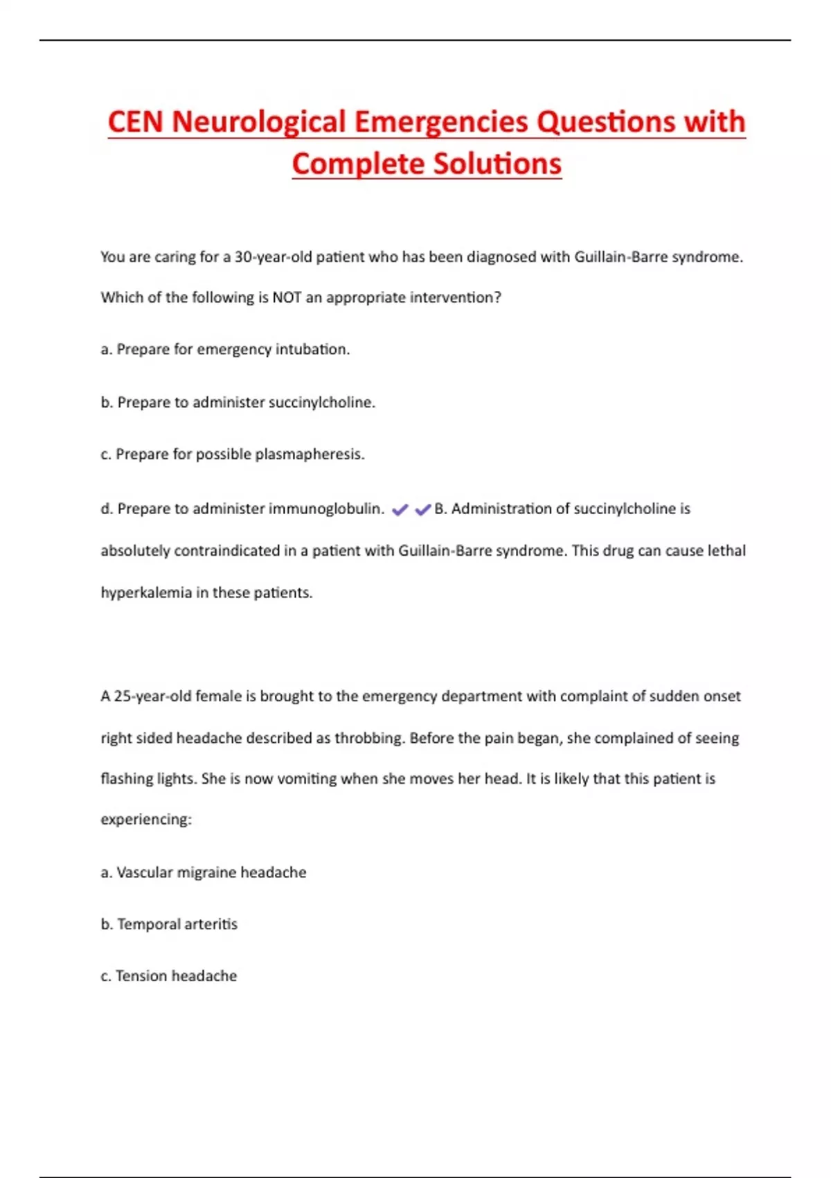 CEN Neurological Emergencies Questions with Complete Solutions You are caring for a 30-year-old patient who has been diagnosed with Guillain-Barre syndrome. Which of the following is NOT an appropriate intervention? a. Prepare for emergency intubation. b. Prepare to administer succinylcholine. c. Prepare for possible plasmapheresis. d. Prepare to administer immunoglobulin. B. Administration of succinylcholine is absolutely contraindicated in a patient with Guillain-Barre syndrome. This drug can cause lethal hyperkalemia in these patients