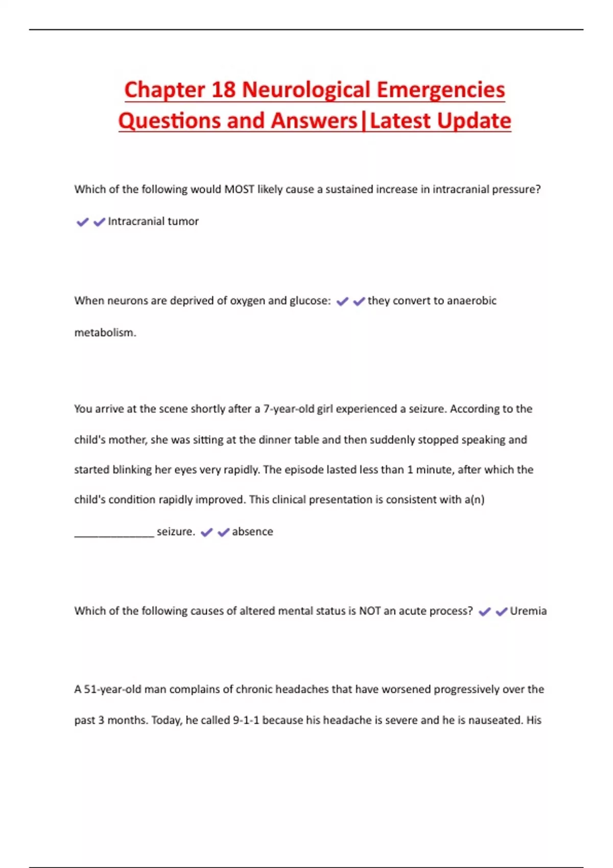 Chapter 18 Neurological Emergencies Questions and Answers|Latest Update Which of the following would MOST likely cause a sustained increase in intracranial pressure? Intracranial tumor When neurons are deprived of oxygen and glucose: they convert to anaerobic metabolism. You arrive at the scene shortly after a 7-year-old girl experienced a seizure. According to the child's mother, she was sitting at the dinner table and then suddenly stopped speaking and started blinking her eyes very rapidly. The episode lasted less than 1 minute, after which the child's condition rapidly improved. This clinical presentation is consistent with a(n) _____________ seizure. absence