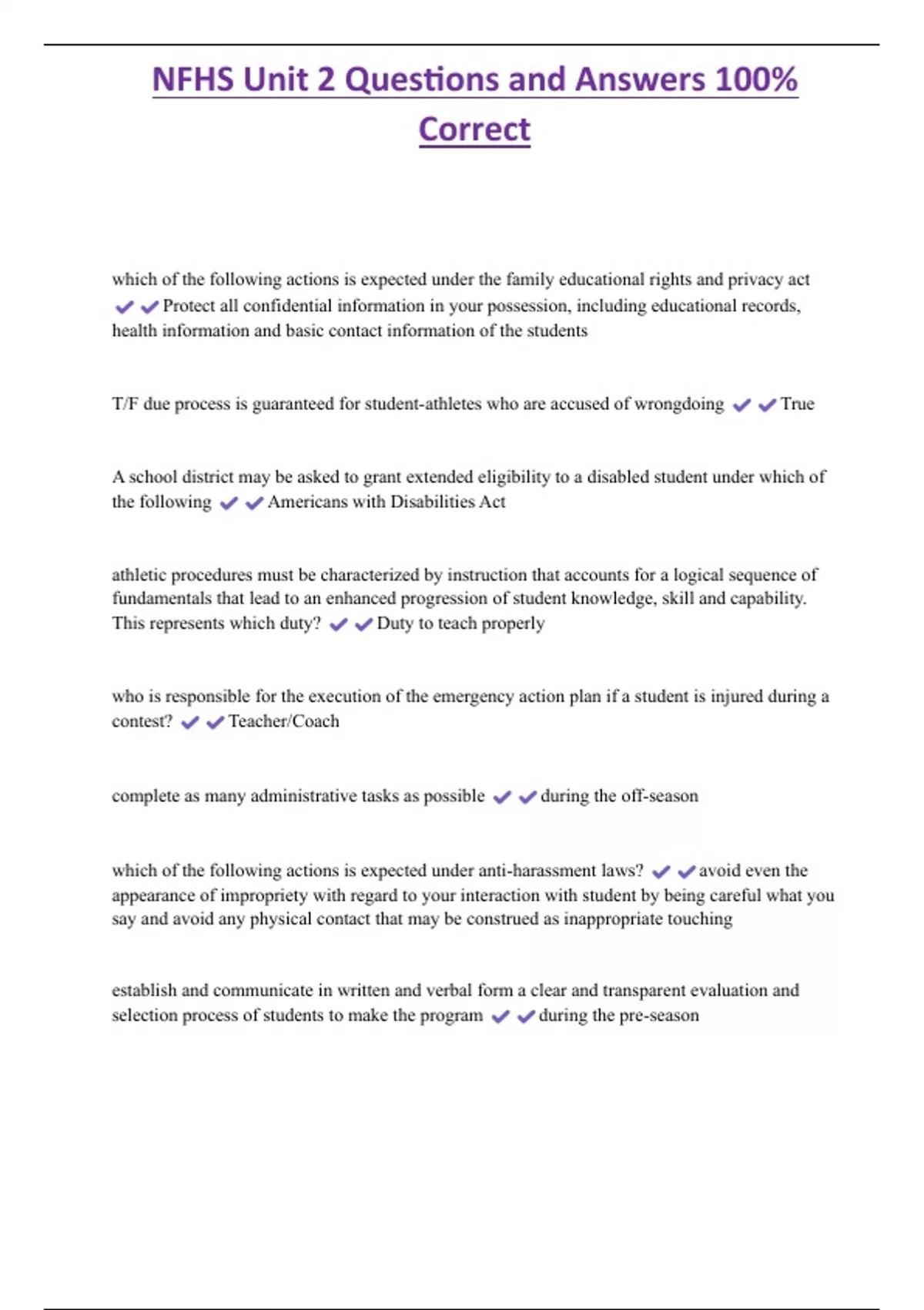 NFHS Unit 2 Questions and Answers 100% Correct which of the following actions is expected under the family educational rights and privacy act Protect all confidential information in your possession, including educational records, health information and basic contact information of the students T/F due process is guaranteed for student-athletes who are accused of wrongdoing True A school district may be asked to grant extended eligibility to a disabled student under which of the following Americans with Disabilities Act athletic procedures must be characterized by instruction that accounts for a logical sequence of fundamentals that lead to an enhanced progression of student knowledge, skill and capability. This represents which duty? Duty to teach properly