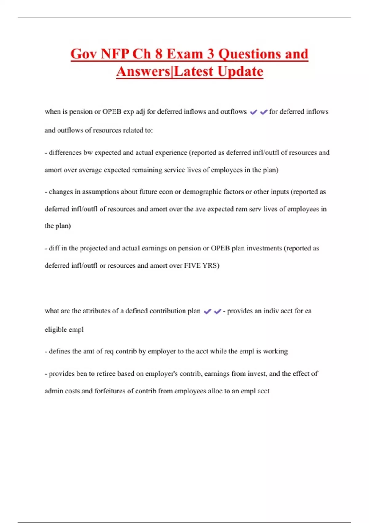 Gov NFP Ch 8 Exam 3 Questions and Answers|Latest Update when is pension or OPEB exp adj for deferred inflows and outflows for deferred inflows and outflows of resources related to: - differences bw expected and actual experience (reported as deferred infl/outfl of resources and amort over average expected remaining service lives of employees in the plan) - changes in assumptions about future econ or demographic factors or other inputs (reported as deferred infl/outfl of resources and amort over the ave expected rem serv lives of employees in the plan) - diff in the projected and actual earnings on pension or OPEB plan investments (reported as deferred infl/outfl or resources and amort over FIVE YRS)