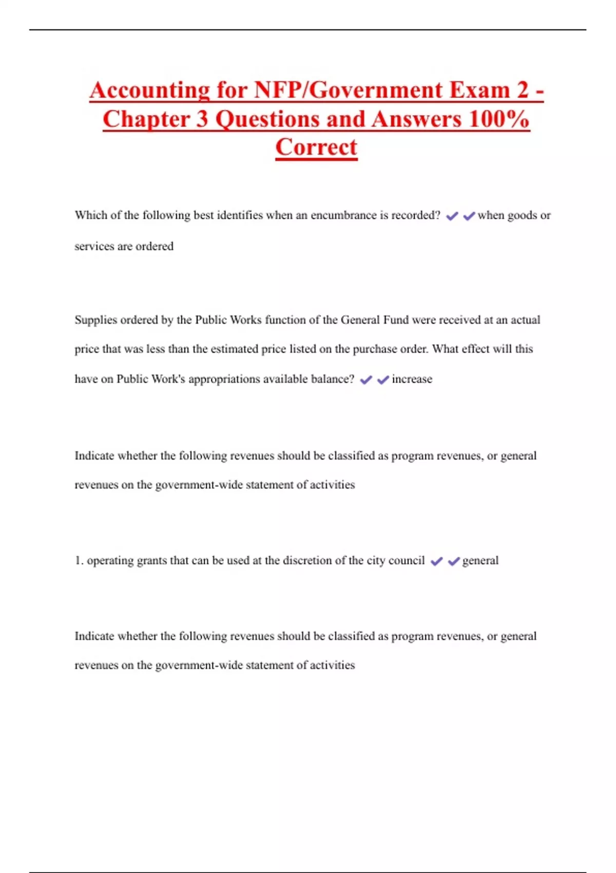 Accounting for NFP/Government Exam 2 - Chapter 3 Questions and Answers 100% Correct Which of the following best identifies when an encumbrance is recorded? when goods or services are ordered Supplies ordered by the Public Works function of the General Fund were received at an actual price that was less than the estimated price listed on the purchase order. What effect will this have on Public Work's appropriations available balance? increase