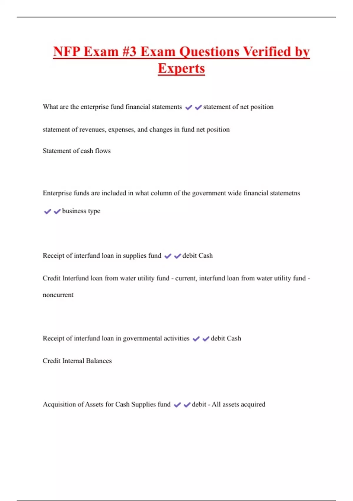 NFP Exam #3 Exam Questions Verified by Experts What are the enterprise fund financial statements statement of net position statement of revenues, expenses, and changes in fund net position Statement of cash flows Enterprise funds are included in what column of the government wide financial statemetns business type