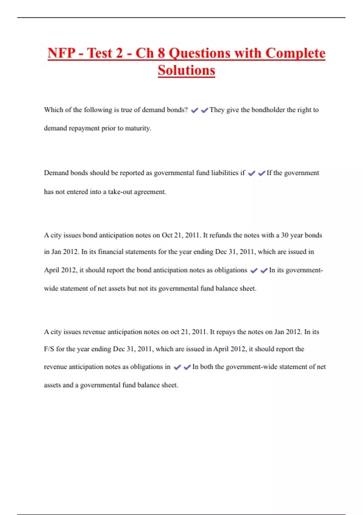 NFP - Test 2 - Ch 8 Questions with Complete Solutions Which of the following is true of demand bonds? They give the bondholder the right to demand repayment prior to maturity. Demand bonds should be reported as governmental fund liabilities if If the government has not entered into a take-out agreement. A city issues bond anticipation notes on Oct 21, 2011. It refunds the notes with a 30 year bonds in Jan 2012. In its financial statements for the year ending Dec 31, 2011, which are issued in April 2012, it should report the bond anticipation notes as obligations In its governmentwide statement of net assets but not its governmental fund balance sheet.