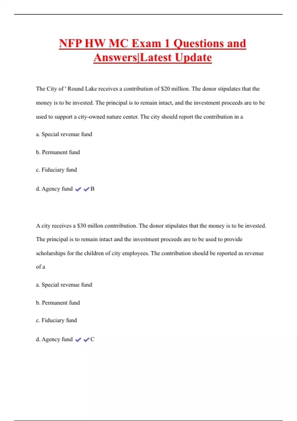 NFP HW MC Exam 1 Questions and Answers|Latest Update The City of ' Round Lake receives a contribution of $20 million. The donor stipulates that the money is to be invested. The principal is to remain intact, and the investment proceeds are to be used to support a city-owned nature center. The city should report the contribution in a a. Special revenue fund b. Permanent fund c. Fiduciary fund d. Agency fund B