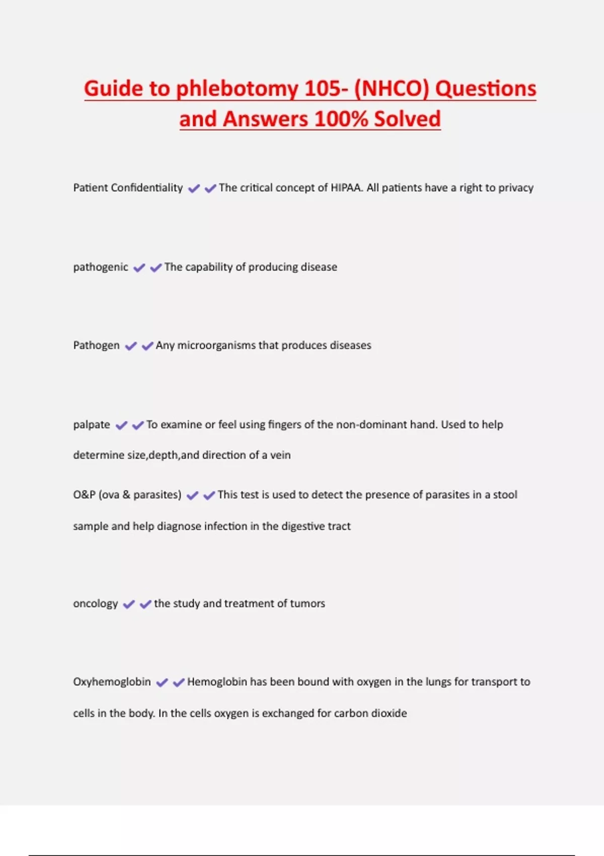 Guide to phlebotomy 105- (NHCO) Questions and Answers 100% Solved Patient Confidentiality The critical concept of HIPAA. All patients have a right to privacy pathogenic The capability of producing disease Pathogen Any microorganisms that produces diseases palpate To examine or feel using fingers of the non-dominant hand. Used to help determine size,depth,and direction of a vein O&P (ova & parasites) This test is used to detect the presence of parasites in a stool sample and help diagnose infection in the digestive tract