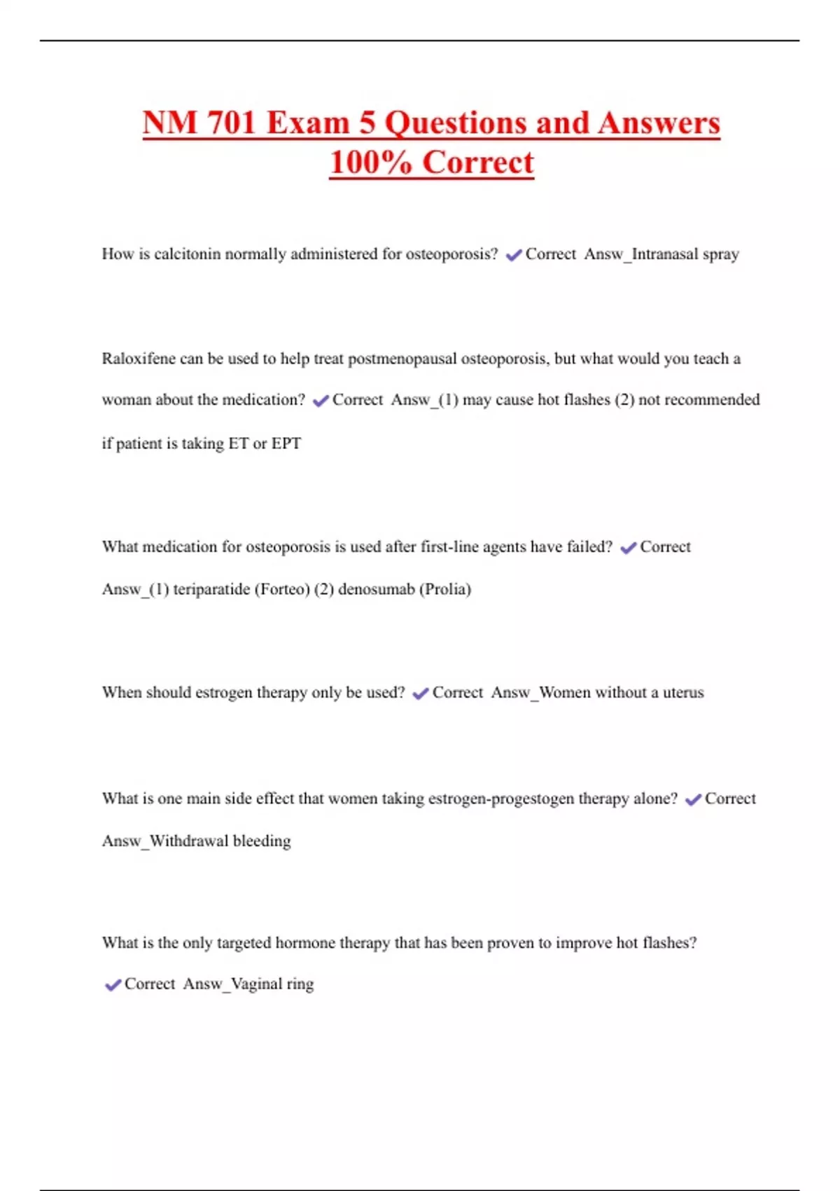 NM 701 Exam 5 Questions and Answers 100% Correct How is calcitonin normally administered for osteoporosis? Correct Answ_Intranasal spray Raloxifene can be used to help treat postmenopausal osteoporosis, but what would you teach a woman about the medication? Correct Answ_(1) may cause hot flashes (2) not recommended if patient is taking ET or EPT What medication for osteoporosis is used after first-line agents have failed? Correct Answ_(1) teriparatide (Forteo) (2) denosumab (Prolia)