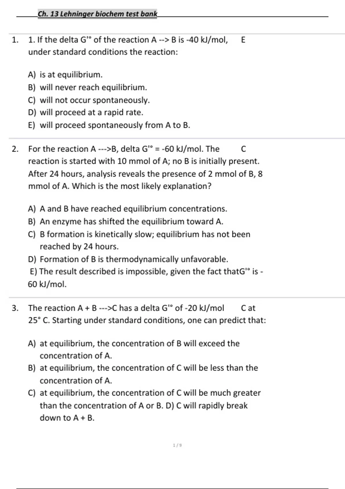 1. 1. If the delta G'° of the reaction A --> B is -40 kJ/mol, E