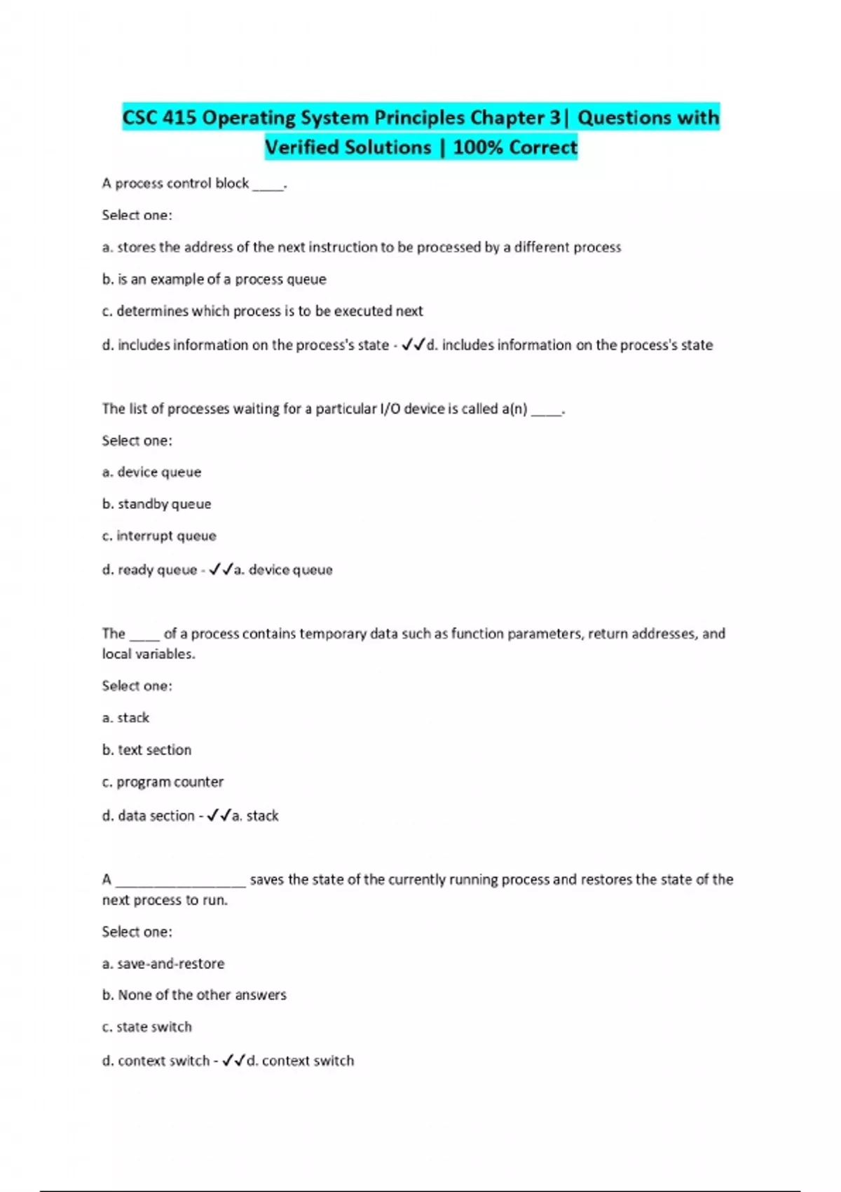 CSC 415 Operating System Principles Chapter 3| Questions with Verified Solutions | 100% Correct