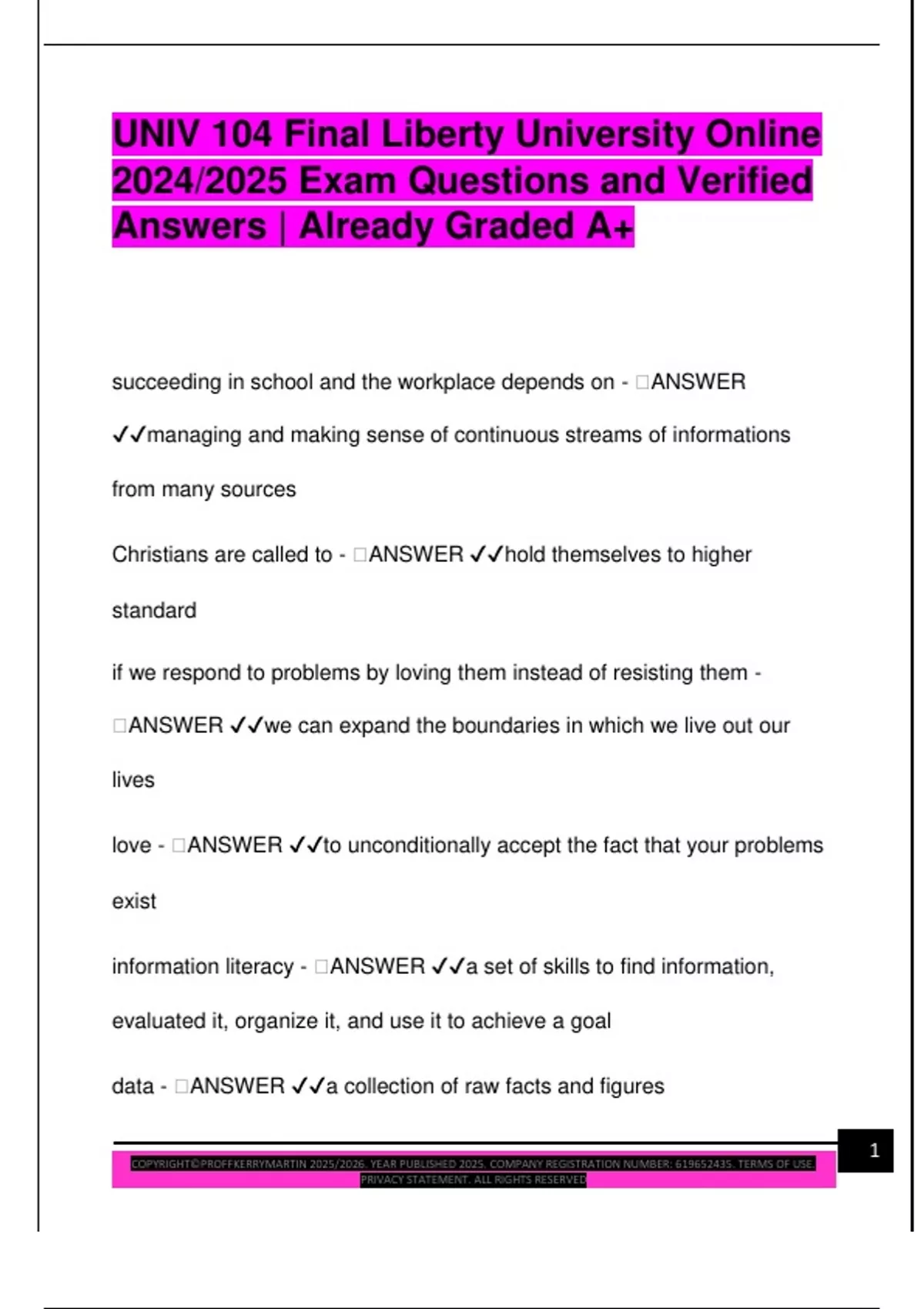 UNIV 104 Final Liberty University Online 2024/2025 Exam Questions and Verified Answers | Already Graded A+