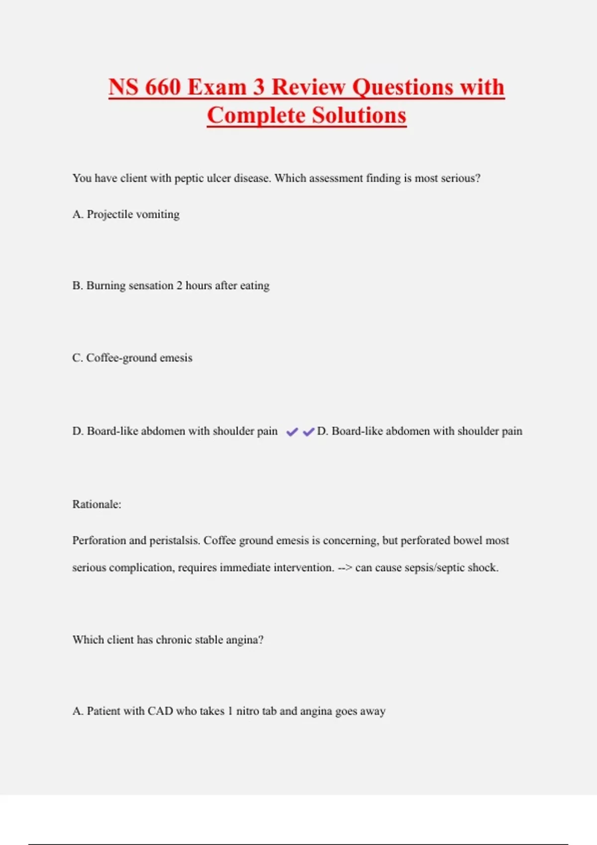 NS 660 Exam 3 Review Questions with Complete Solutions You have client with peptic ulcer disease. Which assessment finding is most serious? A. Projectile vomiting B. Burning sensation 2 hours after eating C. Coffee-ground emesis D. Board-like abdomen with shoulder pain D. Board-like abdomen with shoulder pain
