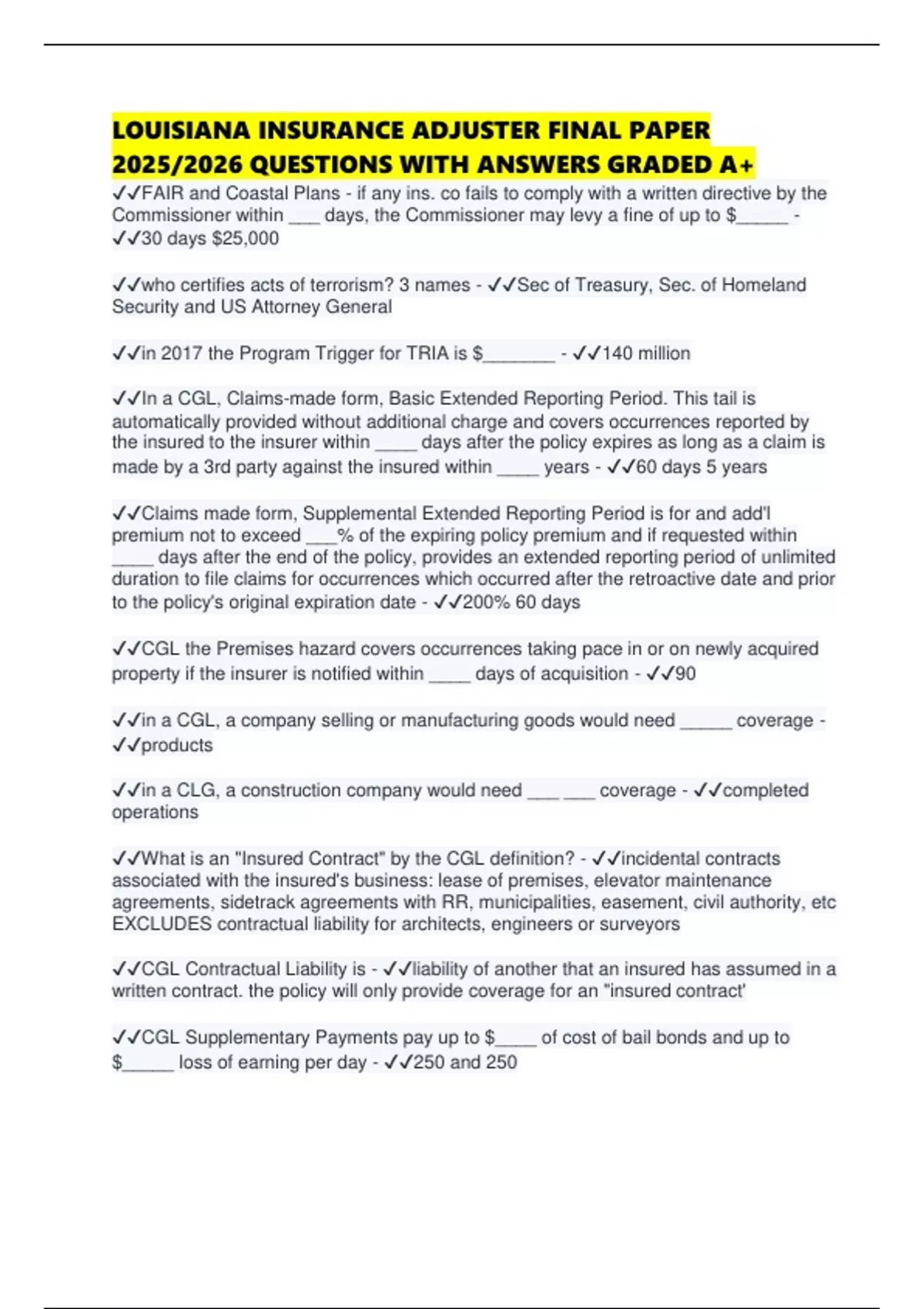 LOUISIANA INSURANCE ADJUSTER FINAL PAPER 2025/2026 QUESTIONS WITH ANSWERS GRADED A+
