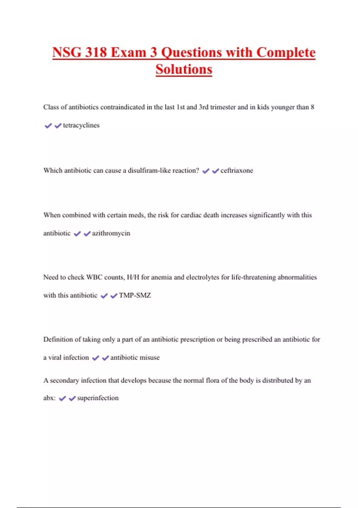 NSG 318 Exam 3 Questions with Complete Solutions Class of antibiotics contraindicated in the last 1st and 3rd trimester and in kids younger than 8 tetracyclines Which antibiotic can cause a disulfiram-like reaction? ceftriaxone When combined with certain meds, the risk for cardiac death increases significantly with this antibiotic azithromycin