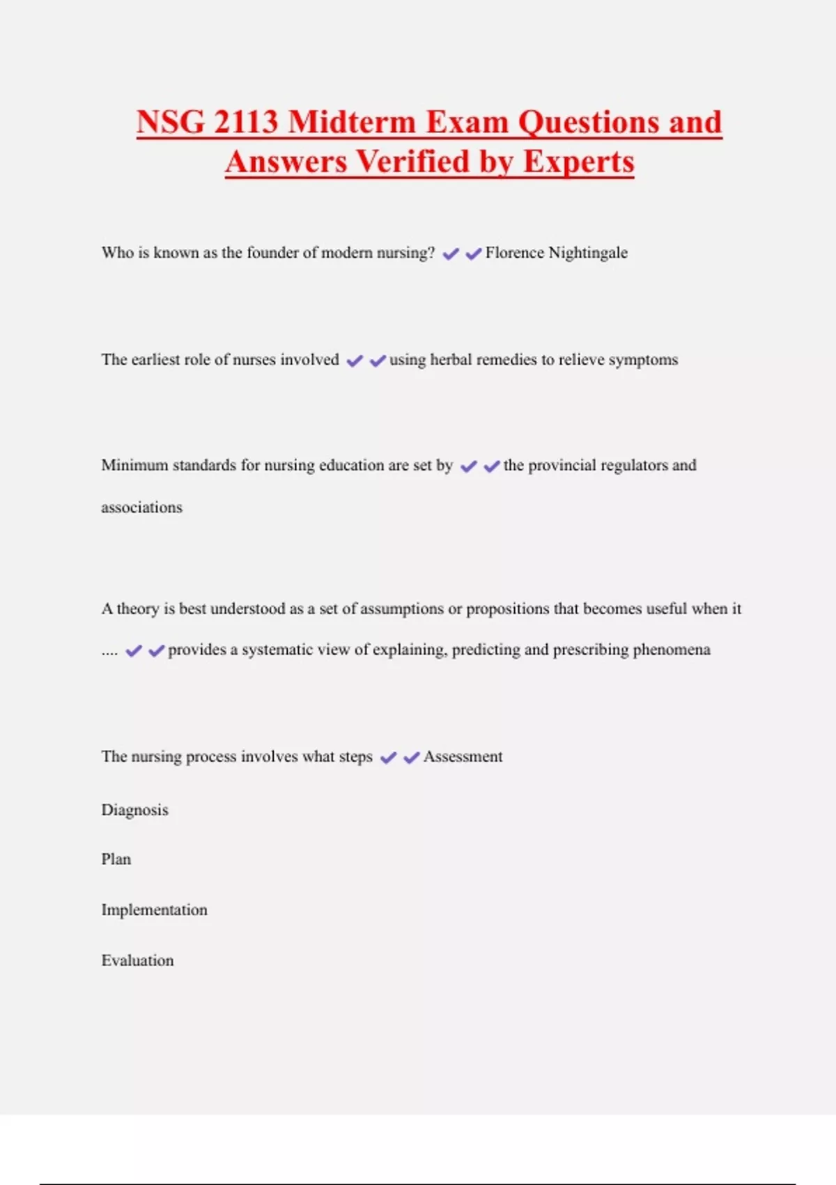 NSG 2113 Midterm Exam Questions and Answers Verified by Experts Who is known as the founder of modern nursing? Florence Nightingale The earliest role of nurses involved using herbal remedies to relieve symptoms Minimum standards for nursing education are set by the provincial regulators and associations A theory is best understood as a set of assumptions or propositions that becomes useful when it .... provides a systematic view of explaining, predicting and prescribing phenomena