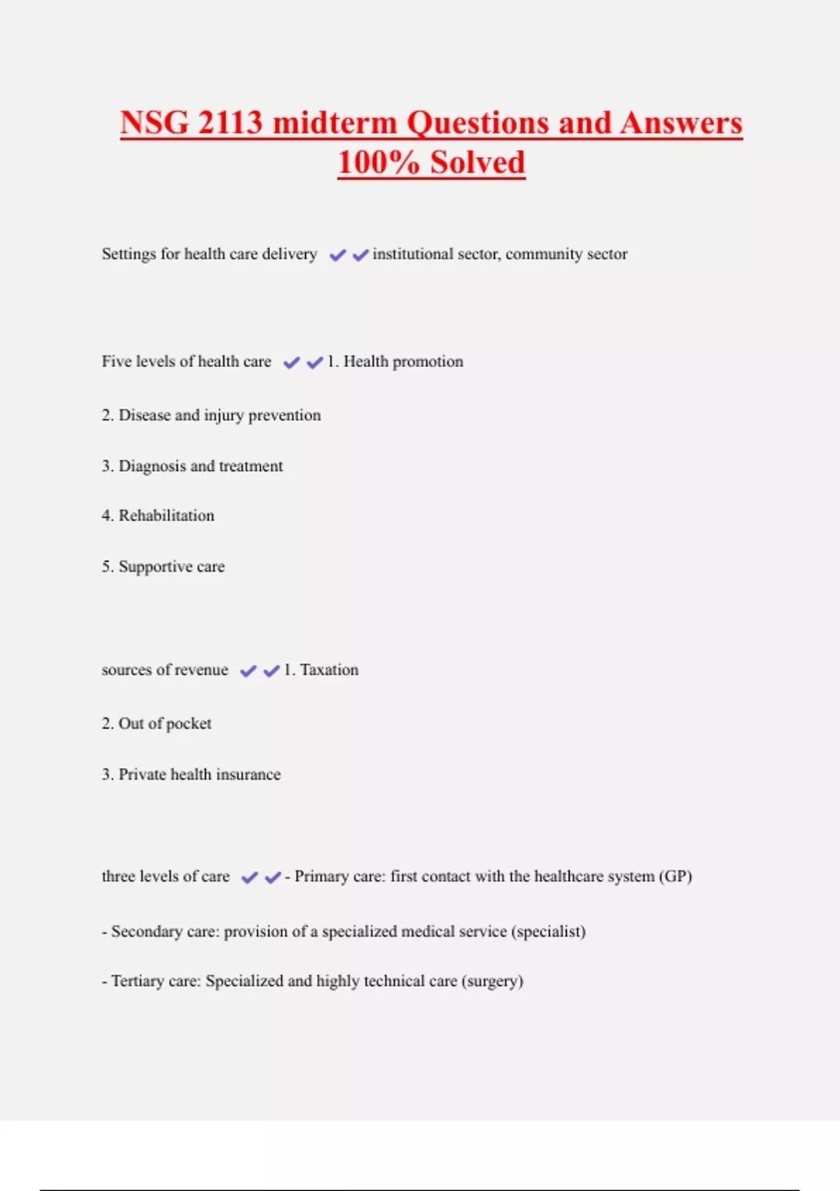 NSG 2113 midterm Questions and Answers 100% Solved Settings for health care delivery institutional sector, community sector Five levels of health care 1. Health promotion 2. Disease and injury prevention 3. Diagnosis and treatment 4. Rehabilitation 5. Supportive care