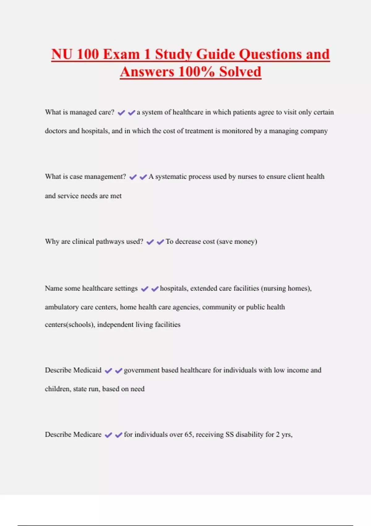 NU 100 Exam 1 Study Guide Questions and Answers 100% Solved What is managed care? a system of healthcare in which patients agree to visit only certain doctors and hospitals, and in which the cost of treatment is monitored by a managing company What is case management? A systematic process used by nurses to ensure client health and service needs are met Why are clinical pathways used? To decrease cost (save money)