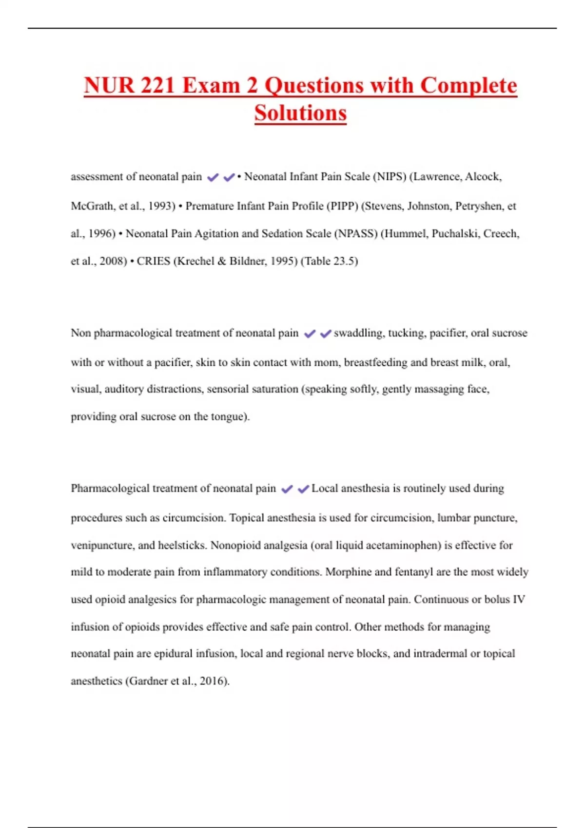 NUR 221 Exam 2 Questions with Complete Solutions assessment of neonatal pain • Neonatal Infant Pain Scale (NIPS) (Lawrence, Alcock, McGrath, et al., 1993) • Premature Infant Pain Profile (PIPP) (Stevens, Johnston, Petryshen, et al., 1996) • Neonatal Pain Agitation and Sedation Scale (NPASS) (Hummel, Puchalski, Creech, et al., 2008) • CRIES (Krechel & Bildner, 1995) (Table 23.5) Non pharmacological treatment of neonatal pain swaddling, tucking, pacifier, oral sucrose with or without a pacifier, skin to skin contact with mom, breastfeeding and breast milk, oral, visual, auditory distractions, sensorial saturation (speaking softly, gently massaging face, providing oral sucrose on the tongue).