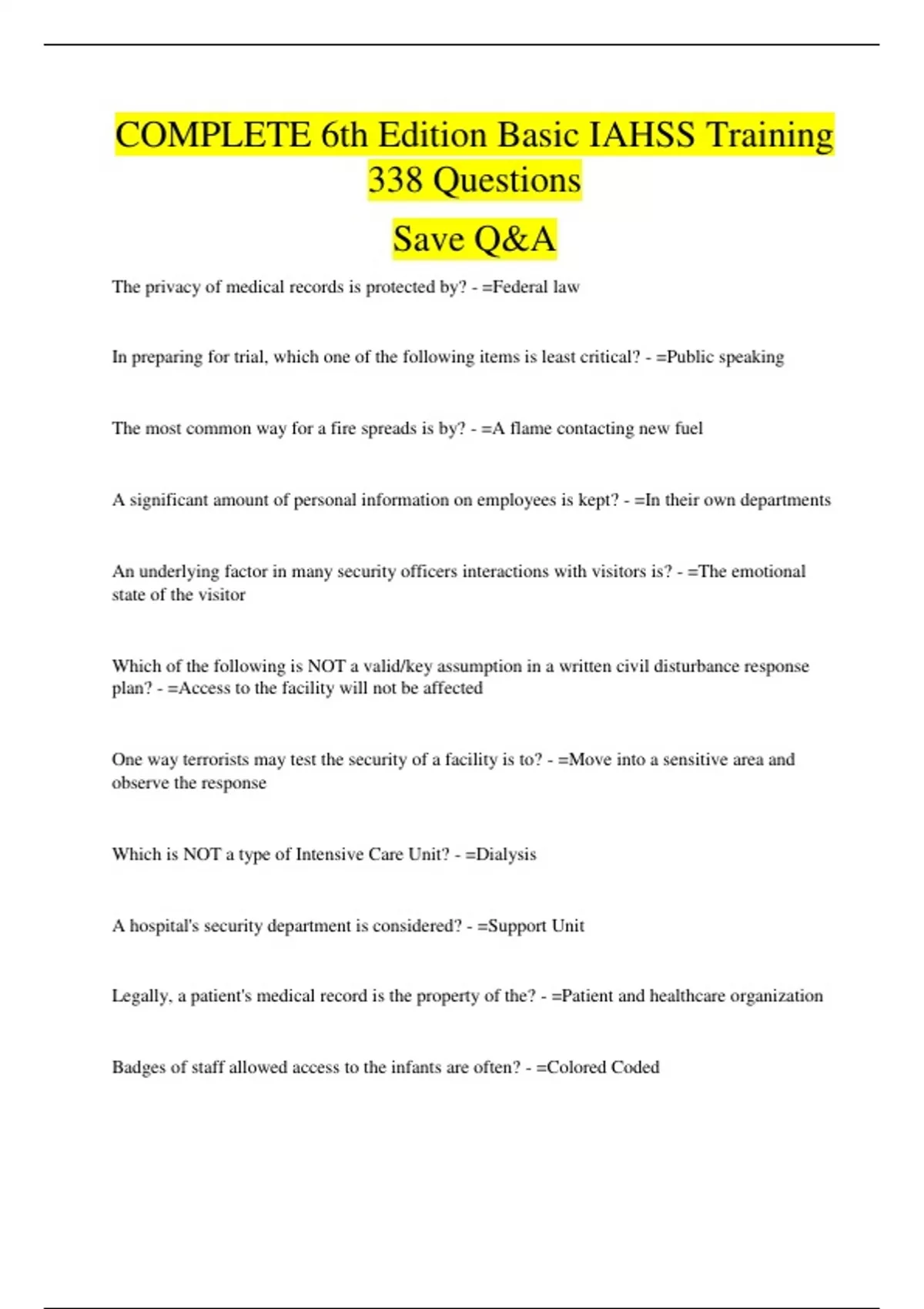 COMPLETE 6th Edition Basic IAHSS Training 338 Questions Save Q&A