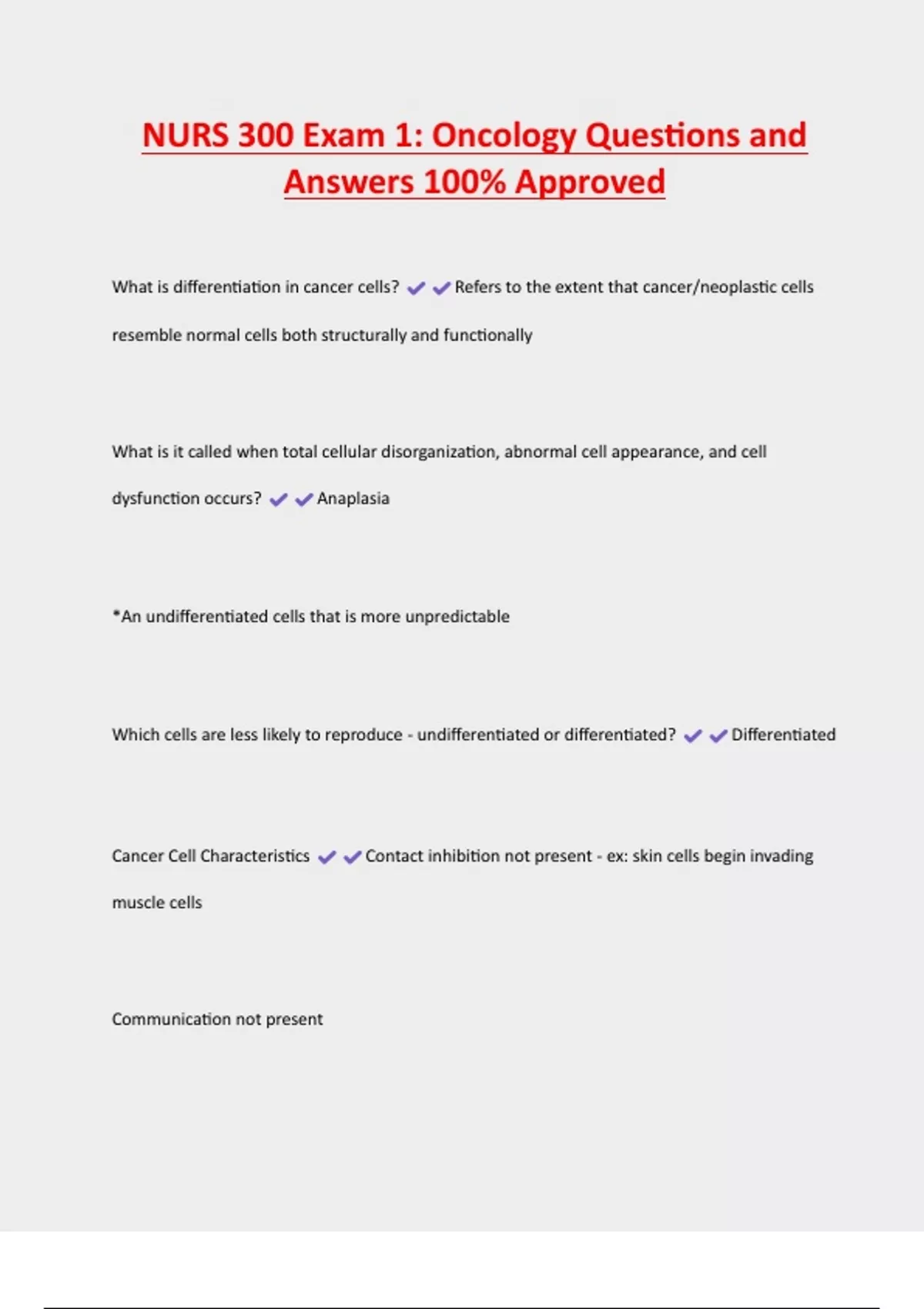 NURS 300 Exam 1: Oncology Questions and Answers 100% Approved What is differentiation in cancer cells? Refers to the extent that cancer/neoplastic cells resemble normal cells both structurally and functionally What is it called when total cellular disorganization, abnormal cell appearance, and cell dysfunction occurs? Anaplasia *An undifferentiated cells that is more unpredictable