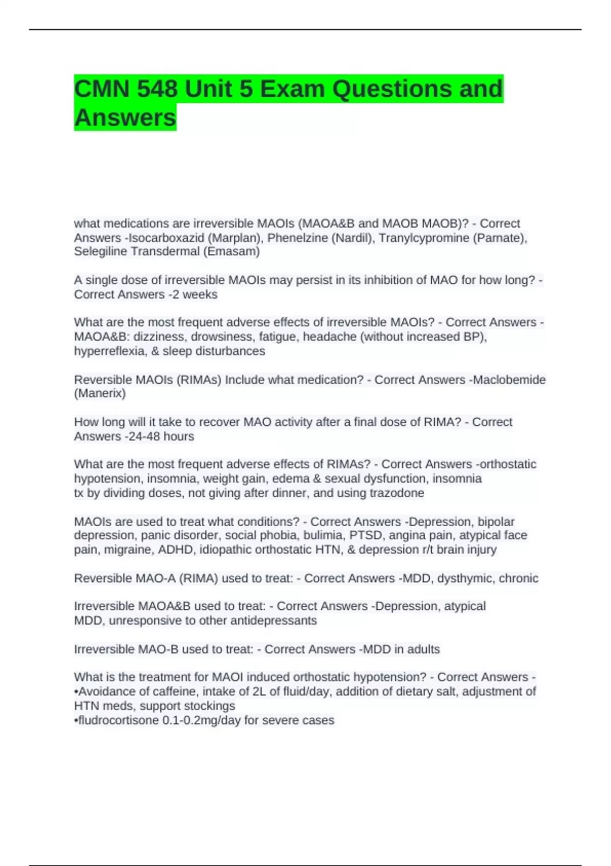 Reversible MAO-A (RIMA) used to treat: - Correct Answers -MDD, dysthymic, chronic