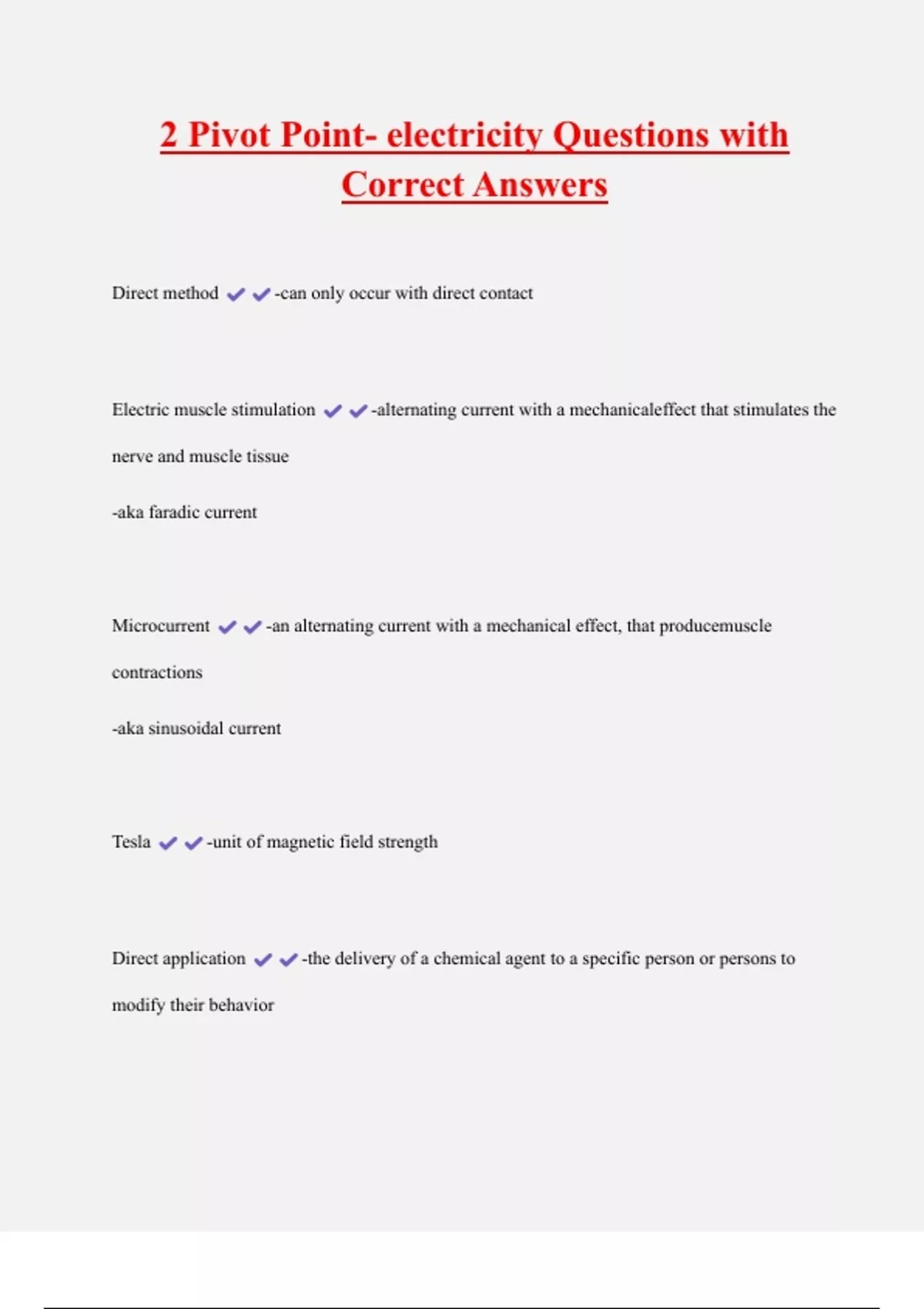 2 Pivot Point- electricity Questions with Correct Answers Direct method -can only occur with direct contact Electric muscle stimulation -alternating current with a mechanicaleffect that stimulates the nerve and muscle tissue -aka faradic current Microcurrent -an alternating current with a mechanical effect, that producemuscle contractions -aka sinusoidal current