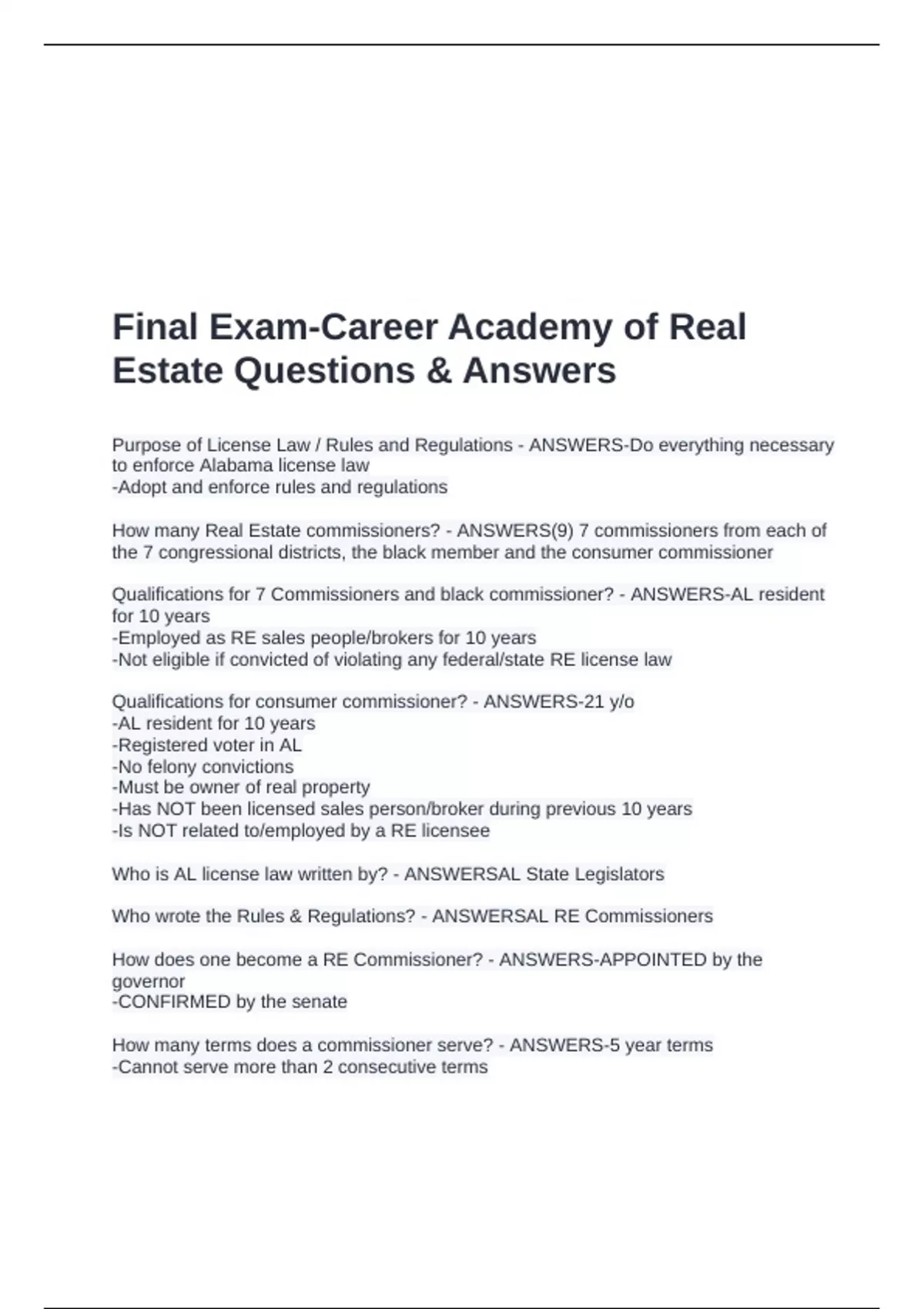 AL Reciprocal License - ANSWERS-Complete 6 hour reciprocal salesperson/broker