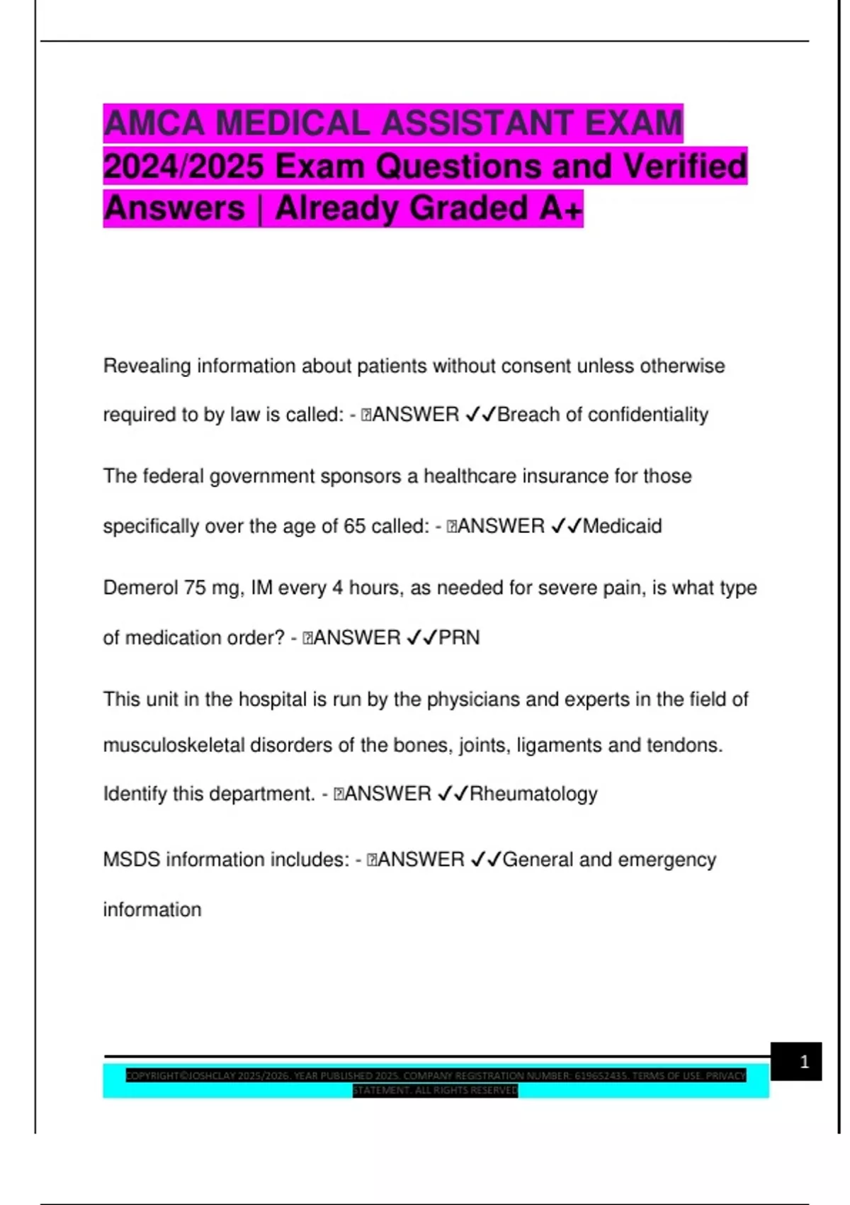 AMCA MEDICAL ASSISTANT EXAM 2024/2025 Exam Questions and Verified Answers | Already Graded A+