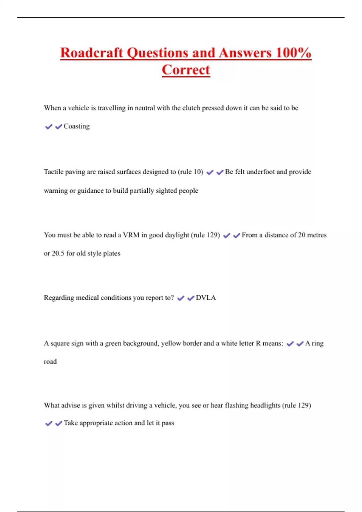 Roadcraft Questions and Answers 100% Correct When a vehicle is travelling in neutral with the clutch pressed down it can be said to be Coasting Tactile paving are raised surfaces designed to (rule 10) Be felt underfoot and provide warning or guidance to build partially sighted people You must be able to read a VRM in good daylight (rule 129) From a distance of 20 metres or 20.5 for old style plates
