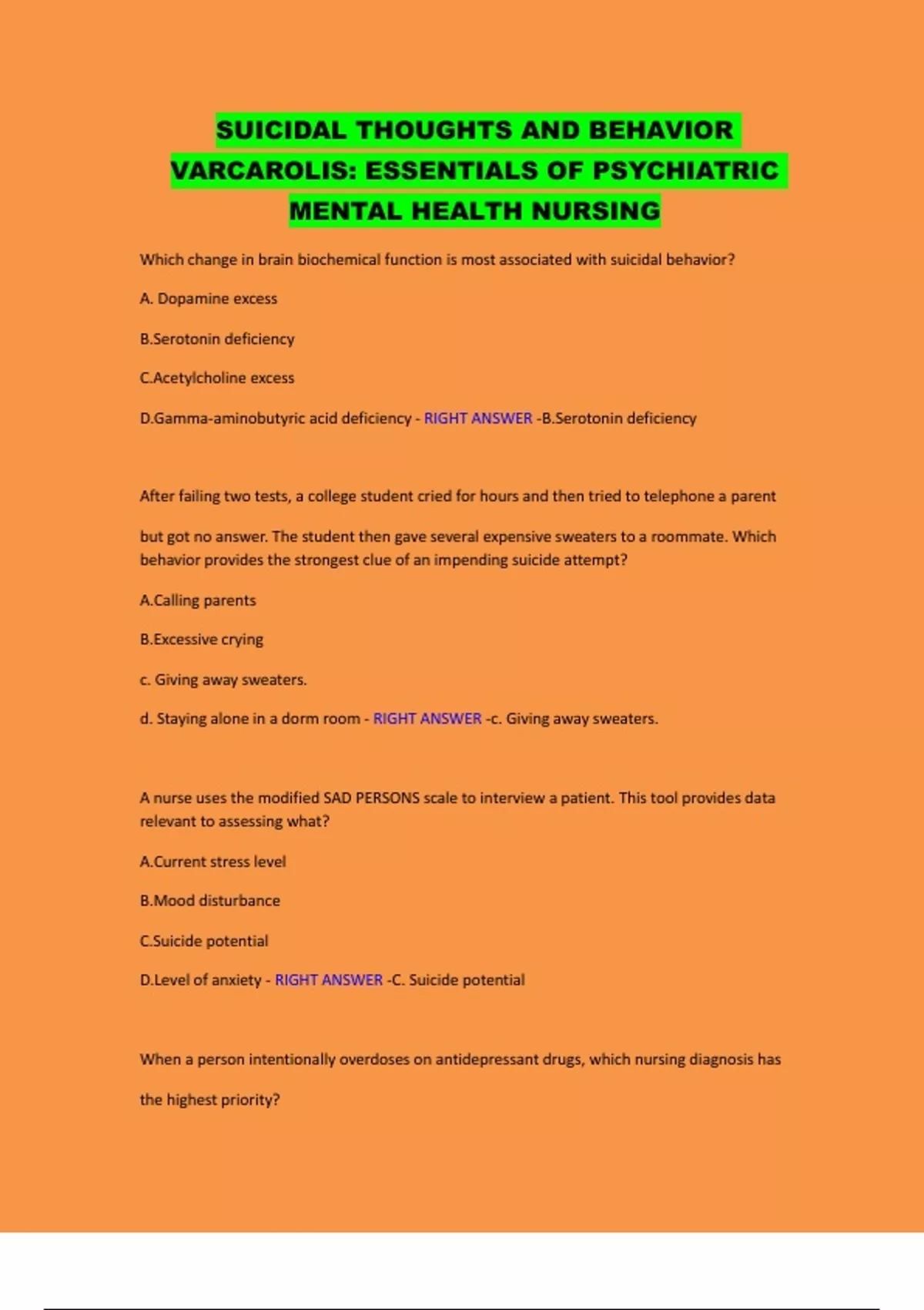 D.Level of anxiety - RIGHT ANSWER -C. Suicide potential