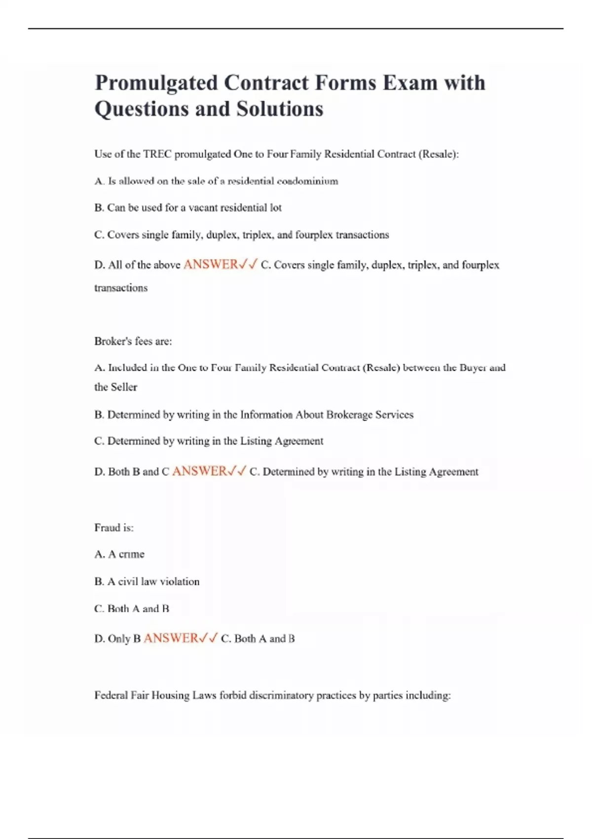 Promulgated Contract Forms Exam with Questions and Solutions Use of the TREC promulgated One to Four Family Residential Contract (Resale): A. Is allowed on the sale of a residential condominium B. Can be used for a vacant residential lot C. Covers single family, duplex, triplex, and fourplex transactions D. All of the above ANSWER C. Covers single family, duplex, triplex, and fourplex transactions Broker's fees are: A. Included in the One to Four Family Residential Contract (Resale) between the Buyer and the Seller B. Determined by writing in the Information About Brokerage Services C. Determined by writing in the Listing Agreement D. Both B and C ANSWER C. Determined by writing in the Listing Agreement Fraud is: A. A crime B. A civil law violation C. Both A and B D. Only B ANSWER C. Both A and B Federal Fair Housing Laws forbid discriminatory practices by parties including:
