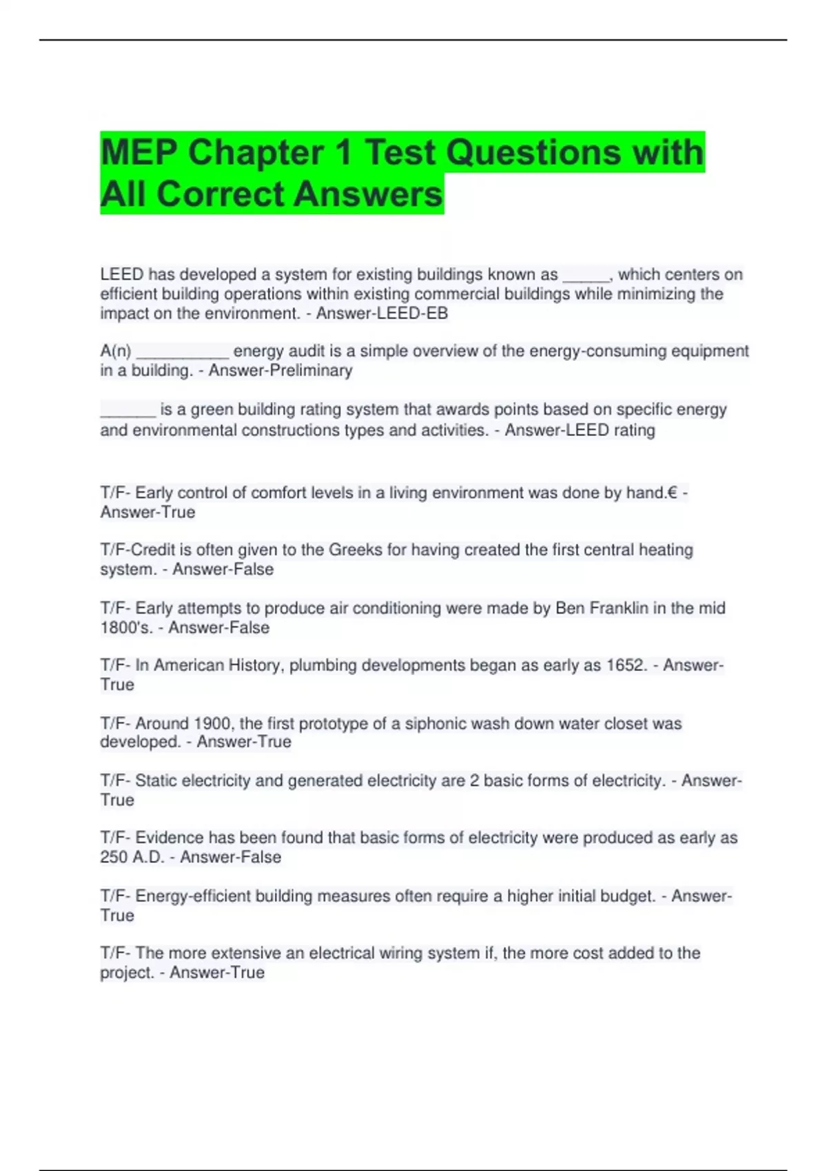 MEP Chapter 1 Test Questions with All Correct Answers
