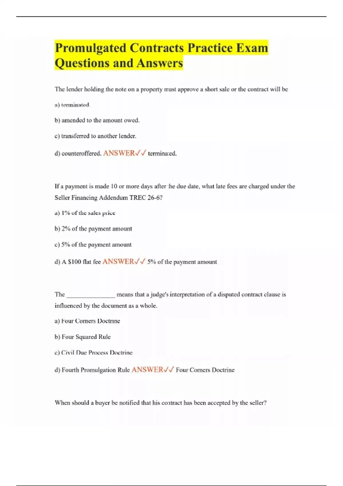 Promulgated Contracts Practice Exam Questions and Answers The lender holding the note on a property must approve a short sale or the contract will be a) terminated. b) amended to the amount owed. c) transferred to another lender. d) counteroffered. ANSWER terminated. If a payment is made 10 or more days after the due date, what late fees are charged under the Seller Financing Addendum TREC 26-6? a) 1% of the sales price b) 2% of the payment amount c) 5% of the payment amount d) A $100 flat fee ANSWER 5% of the payment amount The _______________ means that a judge's interpretation of a disputed contract clause is influenced by the document as a whole. a) Four Corners Doctrine b) Four Squared Rule c) Civil Due Process Doctrine d) Fourth Promulgation Rule ANSWER Four Corners Doctrine When should a buyer be notified that his contract has been accepted by the seller?