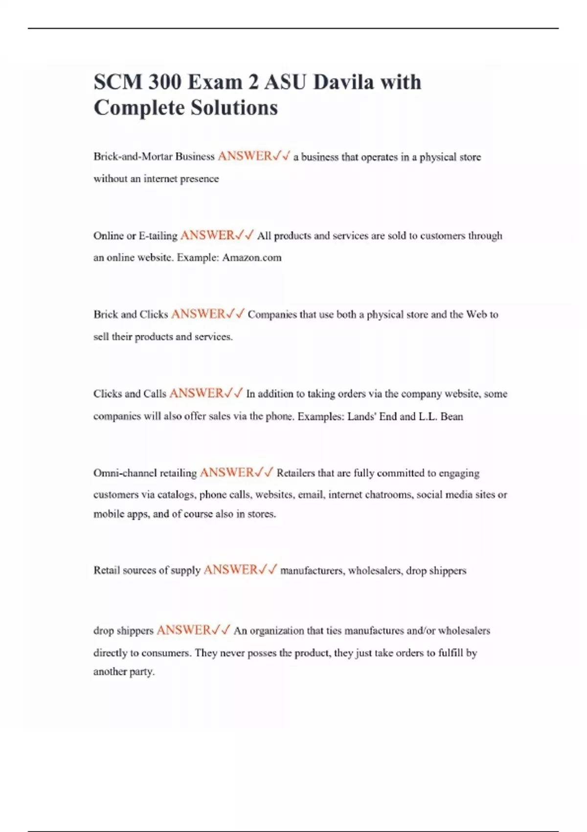 SCM 300 Exam 2 ASU Davila with Complete Solutions Brick-and-Mortar Business ANSWER a business that operates in a physical store without an internet presence Online or E-tailing ANSWER All products and services are sold to customers through an online website. Example: A Brick and Clicks ANSWER Companies that use both a physical store and the Web to sell their products and services. Clicks and Calls ANSWER In addition to taking orders via the company website, some companies will also offer sales via the phone. Examples: Lands' End and L.L. Bean Omni-channel retailing ANSWER Retailers that are fully committed to engaging customers via catalogs, phone calls, websites, email, internet chatrooms, social media sites or mobile apps, and of course also in stores. Retail sources of supply ANSWER manufacturers, wholesalers, drop shippers drop shippers ANSWER An organization that ties manufactures and/or wholesalers directly to consumers. They never posses the product, they just take orders to fulfill by another party.
