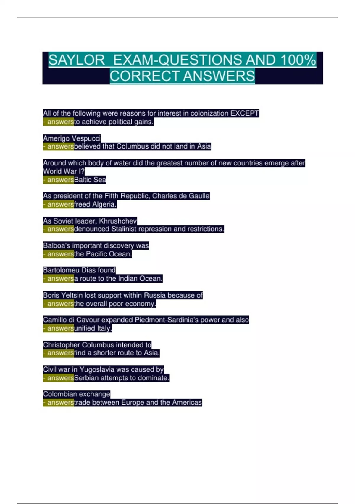 Ace your Saylor Academy World History exam with this ultimate study guide! This comprehensive document features 100% verified exam questions and answers, covering critical topics like European colonization, the Industrial Revolution, World Wars I & II, the Cold War, and key treaties (e.g., Versailles, Tordesillas). Each answer is detailed and historically accurate, ensuring you grasp complex concepts with ease. Perfect for: Saylor Academy students AP World History test-takers College-level history review Self-learners seeking concise, high-yield content Why buy this guide? Exam-Aligned: Directly mirrors Saylor’s curriculum. Time-Saving: No fluff—just key facts and explanations. Confidence Boost: Walk into your exam knowing you’ve mastered the material. Don’t leave your grade to chance—download now and conquer your exam!