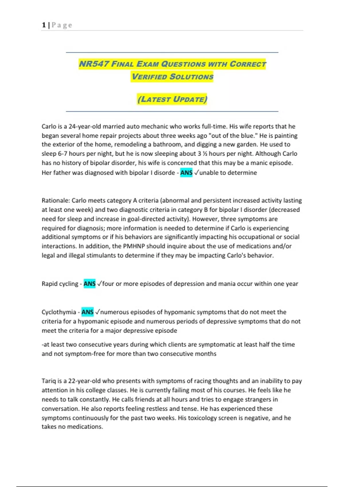 diagnostic criteria for Bipolar I, with symptoms including racing thoughts, difficulty paying