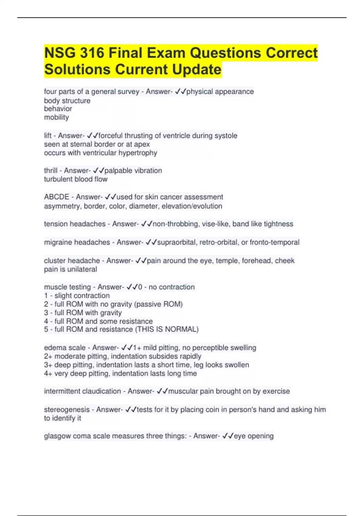 NSG 316 Final Exam Questions Correct Solutions Current Update four parts of a general survey - Answer- physical appearance body structure behavior mobility lift - Answer- forceful thrusting of ventricle during systole seen at sternal border or at apex occurs with ventricular hypertrophy thrill - Answer- palpable vibration turbulent blood flow ABCDE - Answer- used for skin cancer assessment asymmetry, border, color, diameter, elevation/evolution tension headaches - Answer- non-throbbing, vise-like, band like tightness migraine headaches - Answer- supraorbital, retro-orbital, or fronto-temporal cluster headache - Answer- pain around the eye, temple, forehead, cheek pain is unilateral muscle testing - Answer- 0 - no contraction 1 - slight contraction 2 - full ROM with no gravity (passive ROM) 3 - full ROM with gravity 4 - full ROM and some resistance 5 - full ROM and resistance (THIS IS NORMAL) edema scale - Answer- 1+ mild pitting, no perceptible swelling 2+ moderate pitting, indentation subsides rapidly 3+ deep pitting, indentation lasts a short time, leg looks swollen 4+ very deep pitting, indentation lasts long time