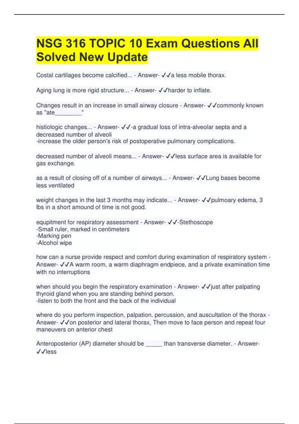 NSG 316 TOPIC 10 Exam Questions All Solevd New Update Costal cartilages become calcified... - Answer- a less mobile thorax. Aging lung is more rigid structure... - Answer- harder to inflate. Changes result in an increase in small airway closure - Answer- commonly known as "ate________" histiologic changes... - Answer- -a gradual loss of intra-alveolar septa and a decreased number of alveoli -increase the older person's risk of postoperative pulmonary complications. decreased number of alveoli means... - Answer- less surface area is available for gas exchange. as a result of closing off of a number of airways... - Answer- Lung bases become less ventilated weight changes in the last 3 months may indicate... - Answer- pulmoary edema, 3 lbs in a short amound of time is not good. equpitment for respiratory assessment - Answer- -Stethoscope -Small ruler, marked in centimeters -Marking pen -Alcohol wipe how can a nurse provide respect and comfort during examination of respiratory system - Answer- A warm room, a warm diaphragm endpiece, and a private examination time with no interruptions when should you begin the respiratory examination - Answer- just after palpating thyroid gland when you are standing behind person. -listen to both the front and the back of the individual where do you perform inspection, palpation, percussion, and auscultation of the thorax - Answer- on posterior and lateral thorax, Then move to face person and repeat four maneuvers on anterior chest Anteroposterior (AP) diameter should be _____ than transverse diameter. - Answer- less symmetric expansion - Answer- -Confirm symmetric chest expansion by placing your warmed hands on the posterolateral chest wall with thumbs at the level of T9 or T10. -Slide your hands medially to pinch up a small fold of skin between your thumbs Ask the person to take a deep breath. -Your hands serve as mechanical amplifiers; as the person inhales deeply, your thumbs should move apart symmetrically. Note any lag in expansion. tactile fremitus - Answer- Palpable vibrations (normal) -Sounds generated from larynx are transmitted through LUNG to chest wall, where you feel them as vibrations. how do you palpate for tactile fremitus - Answer- Use palmar base (ball) of fingers or ulnar edge of one hand -touch person's chest while he or she repeats words, "ninety-nine" or "blue moon." -Start over lung apices and palpate from one side to another -symmetry is most important; vibrations should feel same on each side. o-avoid palpating over scapulae because bone damps out sound transmission. Factors affecting normal intensity of tactile fremitus - Answer- o Thickness of chest wall o Pitch and intensity; thickness of chest wall and fremitus - Answer- -greater over thin wall -Less over obese or muscular one-dampens vibration (may be herder to hear in athletes due to muscle mass) o Pitch and intensity and fremitus - Answer- § loud, lowpitched voice generates more fremitus than soft, high-pitched one. what makes a better conducting medium for sound-increase tactile fremitus. - Answer- increase density of lung tissue what is most important when listening to breath sounds - Answer- Side-to-side comparison is most important. when listening to breath sounds, how should you instruct the batient to breathe? - Answer- Instruct person to breathe through mouth, a little bit deeper than usual