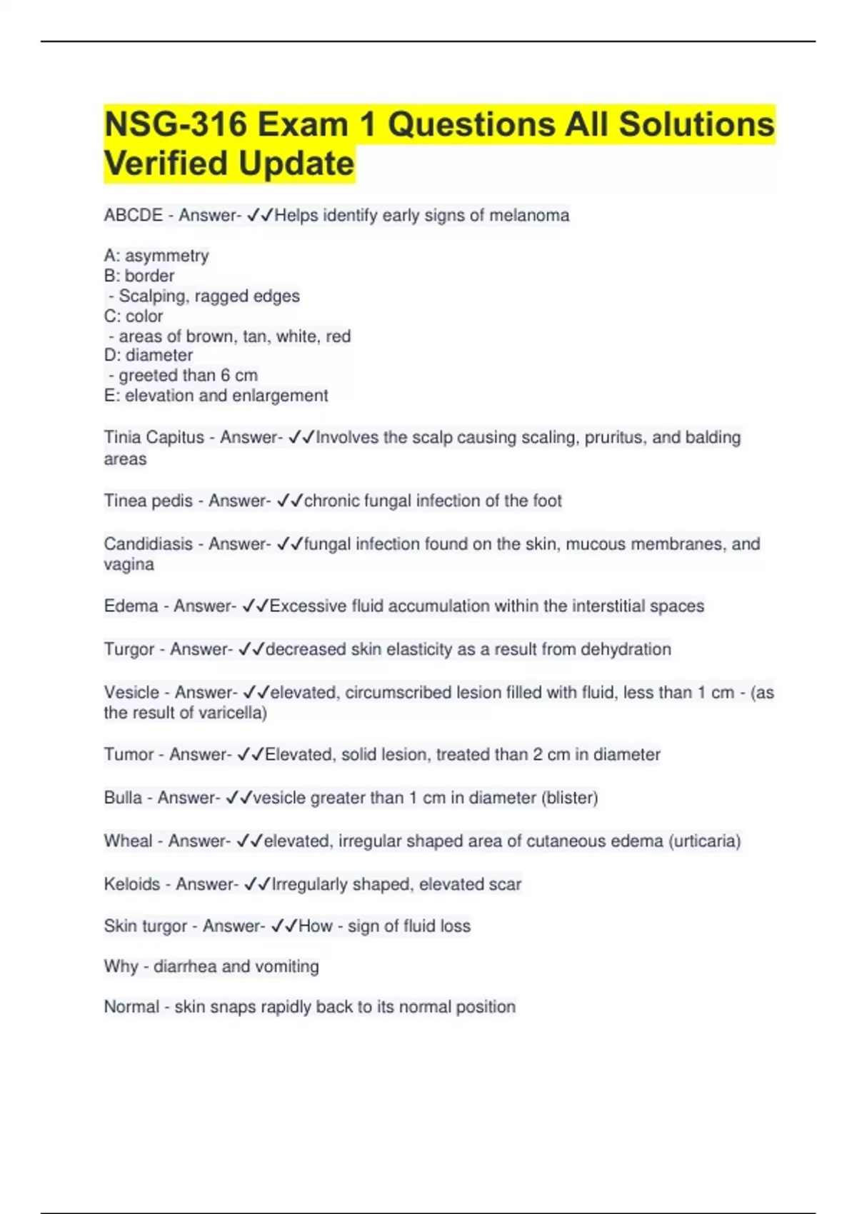 NSG-316 Exam 1 Questions All Solutions Verified Update ABCDE - Answer- Helps identify early signs of melanoma A: asymmetry B: border - Scalping, ragged edges C: color - areas of brown, tan, white, red D: diameter - greeted than 6 cm E: elevation and enlargement Tinia Capitus - Answer- Involves the scalp causing scaling, pruritus, and balding areas Tinea pedis - Answer- chronic fungal infection of the foot Candidiasis - Answer- fungal infection found on the skin, mucous membranes, and vagina Edema - Answer- Excessive fluid accumulation within the interstitial spaces Turgor - Answer- decreased skin elasticity as a result from dehydration Vesicle - Answer- elevated, circumscribed lesion filled with fluid, less than 1 cm - (as the result of varicella) Tumor - Answer- Elevated, solid lesion, treated than 2 cm in diameter Bulla - Answer- vesicle greater than 1 cm in diameter (blister) Wheal - Answer- elevated, irregular shaped area of cutaneous edema (urticaria) Keloids - Answer- Irregularly shaped, elevated scar Skin turgor - Answer- How - sign of fluid loss Why - diarrhea and vomiting Normal - skin snaps rapidly back to its normal position Abnormal - poor turgor or "tenting" indicates dehydration especially combined with delayed capillary refill and tachypnea. Also occurs with malnutrition. Skin with poor turgor takes time to return to its normal position Normal nail findings - Answer- Smooth, pink, 160 degrees Abnormal nail findings - Answer- Brittle, ridged, or spoon-shaped (kiolonychia) -> iron deficiency; splinter hemorrhages -> vitamin C deficiency; clubbing -> heart or respiratory problems Capillary refill - Answer- How - with the index or middle fingertip at heart level, depress the nail edge at least 5 seconds to blanch and then release Why - indicates the status of the peripheral circulation Normal - normally color returns instantly or within a few seconds in a cold environment. A healthy color return takes 1-2 seconds Abnormal - cyanotic nail beds or sluggish color return; consider cardiovascular or respiratory dysfunction, septic shock Primary lesions - Answer- Macules Papules Patches Plaques Nodules Wheals Tumors Urticaria Vesicles Cysts Bullas Pustules How to assess skin lesions - Answer- Note the color, elevation (flat, raised, or pedunculated), pattern or shape (grouping or distinctiveness of each lesion) → pattern may be a sign of a disease, size in cm, location and distribution on body (generalized or localized?), any exudate → note color and odor Palpate lesions → roll a nodule between the thumb and index finger to assess depth Gently scrape scale to see if it comes off → note the nature of the base and note if it bleeds Note skin temp Note if lesions blanch with pressure or stretch Use magnifier and light for closer inspection Use Wood's light to detect fluorescing lesions → with the room darkened, shine the Wood's light on the area Lesions that appear with blue-green fluorescent indicates fungal infection Macules - Answer- solely a color change, flat and circumscribed, of less than 1 cm. ex: freckles, flat nevi, hypopigmentation, petechiae, measles, scarlet fever Edema - definition and scale - Answer- Edema - fluid accumulating in the interstitial space; it is not present normally. To check for edema, imprint your thumbs firmly for 3-4 seconds against the ankle malleolus or the tibia If pressure leaves dent on the skin → "pitting" edema Masks normal skin color and obscures pathologic conditions such as jaundice or cyanosis bc fluid lies between the surface and the pigmented and vascular layers Scale: 1+ → mild, slight indentation, no perceptible swelling 2+ → moderate, indentation subsides rapidly 3+ → deep, indentation remains for short time, appears swollen 4+ → very deep, indentation lasts long time, appears very swollen Papules - Answer- papules - something you can feel (i.e.) solid, elevated, circumscribed, less than 1cm diameter) caused by superficial thiening in epidermis. ex. elevated nevus (moles), lichen planus, molluscum, wart (verruca) Patches - Answer- macules that are longer than 1 cm ex: mongolian spot, vitiligo, cafe au lait spot, chloasma, measles rash Plaques - Answer- Plaques coalesce to form surface elevation wider than 1 cm. A plateau like, disk-shape lesion ex. psoriasis, lichen planus