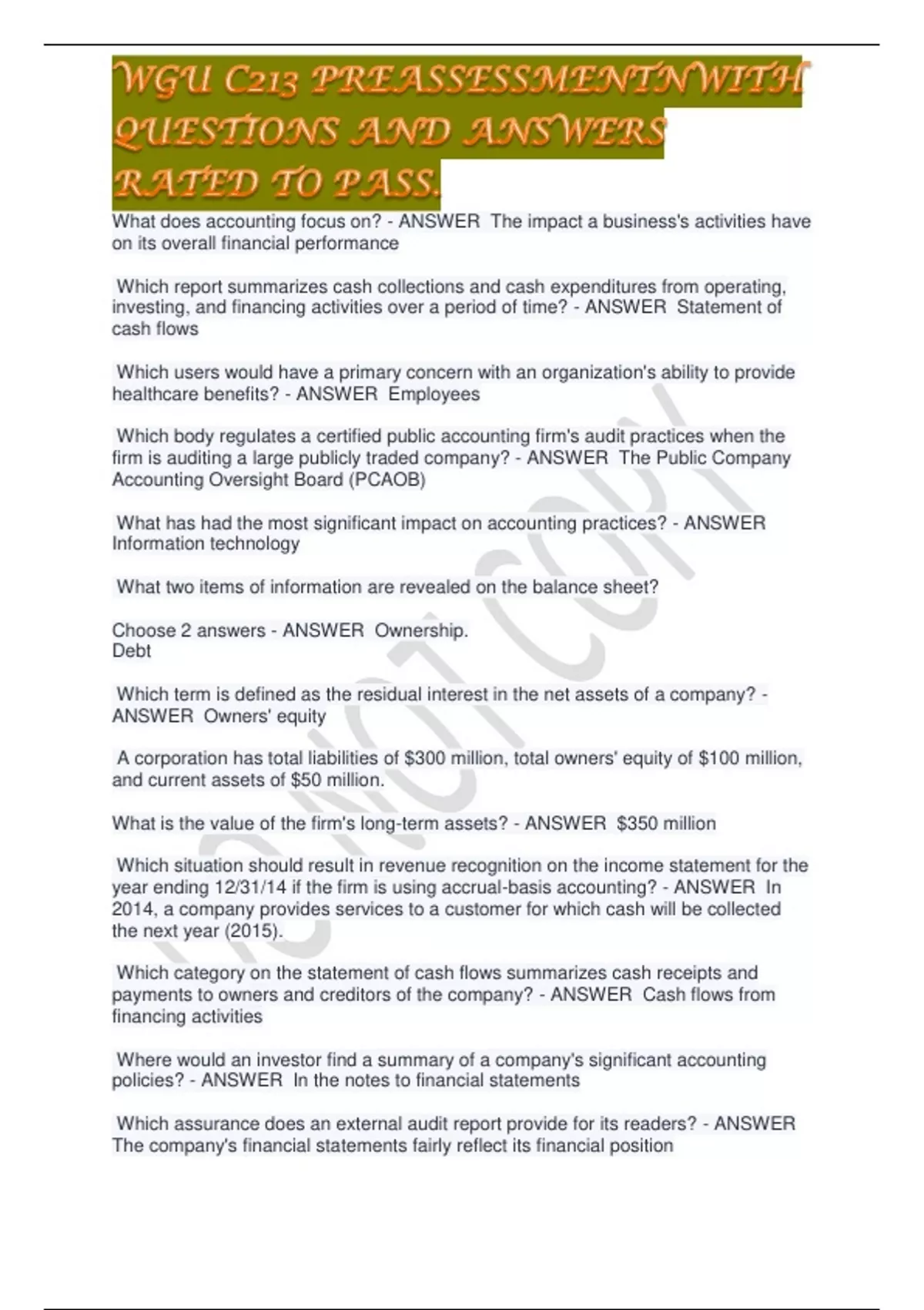 WGU C213 PREASSESSMENTNWITH QUESTIONS AND ANSWERS RATED TO PASS.