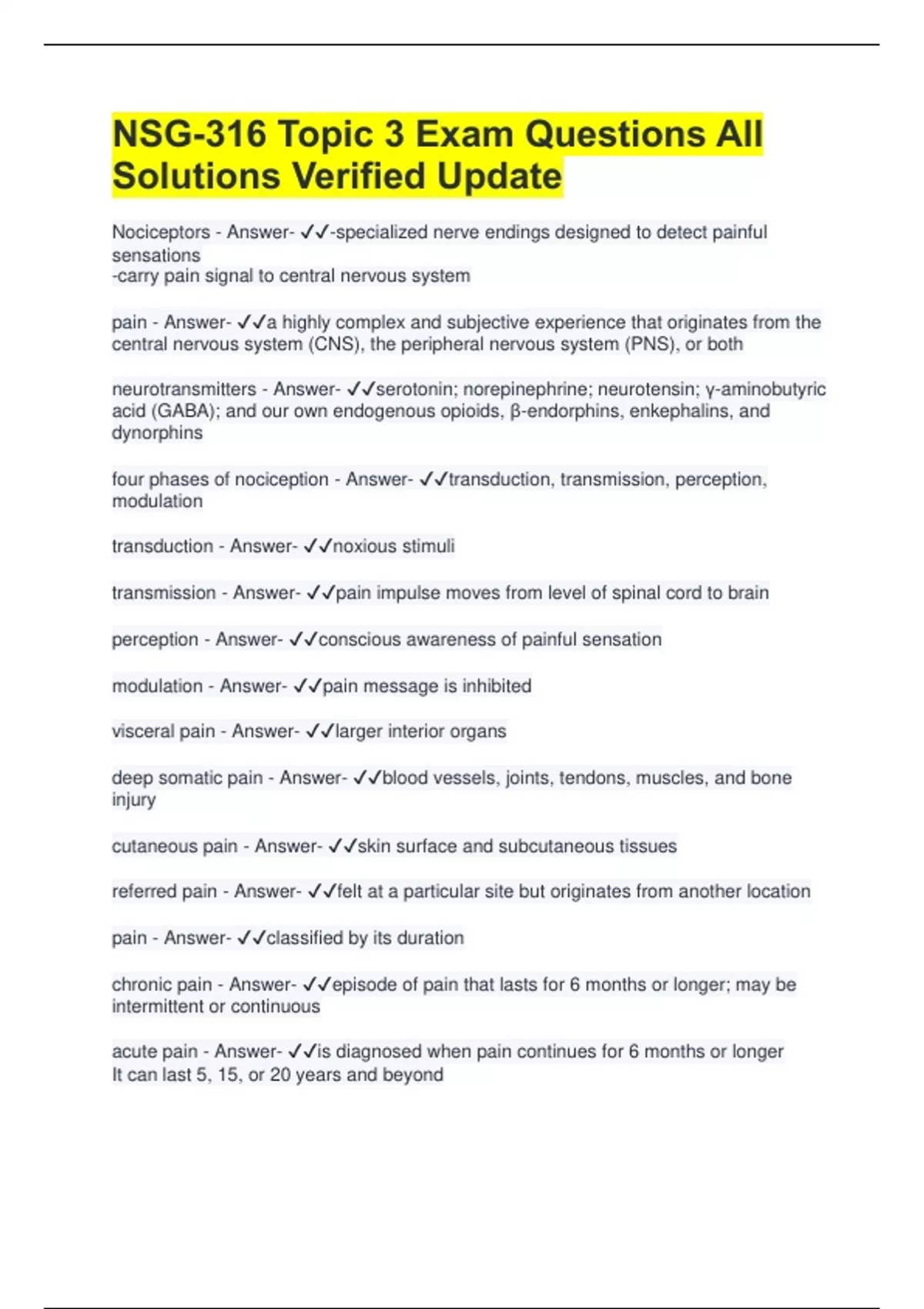 NSG-316 Topic 3 Exam Questions All Solutions Verified Update Nociceptors - Answer- -specialized nerve endings designed to detect painful sensations -carry pain signal to central nervous system pain - Answer- a highly complex and subjective experience that originates from the central nervous system (CNS), the peripheral nervous system (PNS), or both neurotransmitters - Answer- serotonin; norepinephrine; neurotensin; γ-aminobutyric acid (GABA); and our own endogenous opioids, β-endorphins, enkephalins, and dynorphins four phases of nociception - Answer- transduction, transmission, perception, modulation transduction - Answer- noxious stimuli transmission - Answer- pain impulse moves from level of spinal cord to brain perception - Answer- conscious awareness of painful sensation modulation - Answer- pain message is inhibited visceral pain - Answer- larger interior organs deep somatic pain - Answer- blood vessels, joints, tendons, muscles, and bone injury cutaneous pain - Answer- skin surface and subcutaneous tissues referred pain - Answer- felt at a particular site but originates from another location pain - Answer- classified by its duration chronic pain - Answer- episode of pain that lasts for 6 months or longer; may be intermittent or continuous acute pain - Answer- is diagnosed when pain continues for 6 months or longer It can last 5, 15, or 20 years and beyond neuropathic pain - Answer- abnormal processing of pain message; burning, shooting in nature breakthrough pain - Answer- pain that escalates or reoccurs prior to next schedule of analgesia malignant and nonmalignant - Answer- 2 types of chronic pain malignant pain - Answer- lels pathology created by tumor cells uates within the course of the disease e necrosis or stretching of an organ by growing tumor nonmalignant pain - Answer- often associated with musculoskeletal conditions, such as arthritis, low back pain, or fibromyalgia pain - Answer- is patients self report nonmalignant - Answer- -pain does not stop when the injury heals -outlasts its protective purpose -pain intensity does not correspond with the physical findings -originates from abnormal processing of pain fibers from peripheral or central sites 2 - Answer- A patient is crying and says, "Please get me something to relieve this pain." What should the nurse do next? 1.Verify that the patient has an order for pain medications and administer order as directed. 2.Assess the level of pain and ask patient what usually works for his or her pain, administer pain medication as needed, then reassess pain level. 3.Assess the level of pain and give medications according to pain level, and then reassess pain. 4.Reposition the patient, then reassess the pain after intervention.