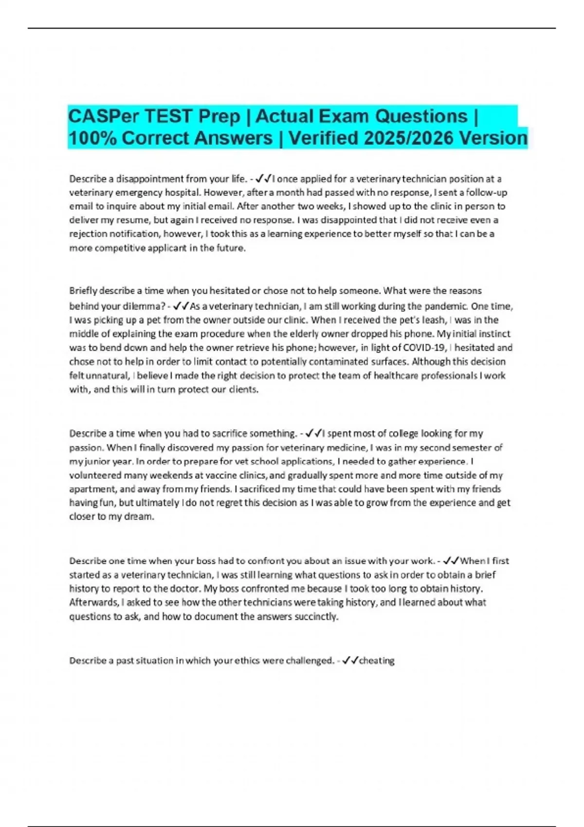 CASPer TEST Prep | Actual Exam Questions | 100% Correct Answers | Verified 2025/2026 Version Describe a disappointment from your life. - I once applied for a veterinary technician position at a veterinary emergency hospital. However, after a month had passed with no response, I sent a follow-up email to inquire about my initial email. After another two weeks, I showed up to the clinic in person to deliver my resume, but again I received no response. I was disappointed that I did not receive even a rejection notification, however, I took this as a learning experience to better myself so that I can be a more competitive applicant in the future. Briefly describe a time when you hesitated or chose not to help someone. What were the reasons behind your dilemma? - As a veterinary technician, I am still working during the pandemic. One time, I was picking up a pet from the owner outside our clinic. When I received the pet's leash, I was in the middle of explaining the exam procedure when the elderly owner dropped his phone. My initial instinct was to bend down and help the owner retrieve his phone; however, in light of COVID-19, I hesitated and chose not to help in order to limit contact to potentially contaminated surfaces. Although this decision felt unnatural, I believe I made the right decision to protect the team of healthcare professionals I work with, and this will in turn protect our clients. Describe a time when you had to sacrifice something. - I spent most of college looking for my passion. When I finally discovered my passion for veterinary medicine, I was in my second semester of my junior year. In order to prepare for vet school applications, I needed to gather experience. I volunteered many weekends at vaccine clinics, and gradually spent more and more time outside of my apartment, and away from my friends. I sacrificed my time that could have been spent with my friends having fun, but ultimately I do not regret this decision as I was able to grow from the experience and get closer to my dream.