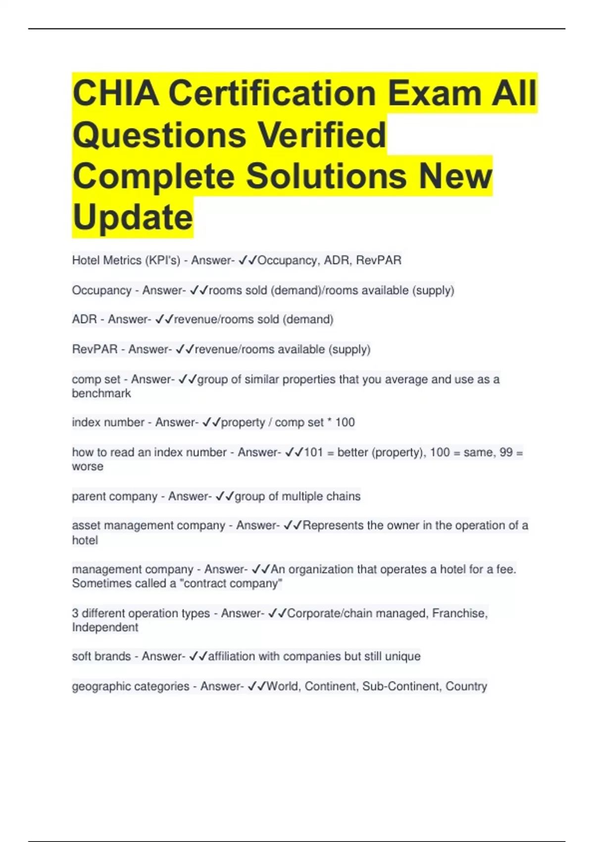 CHIA Certification Exam All Questions Verified Complete Solutions New Update Hotel Metrics (KPI's) - Answer- Occupancy, ADR, RevPAR Occupancy - Answer- rooms sold (demand)/rooms available (supply) ADR - Answer- revenue/rooms sold (demand) RevPAR - Answer- revenue/rooms available (supply) comp set - Answer- group of similar properties that you average and use as a benchmark index number - Answer- property / comp set * 100 how to read an index number - Answer- 101 = better (property), 100 = same, 99 = worse parent company - Answer- group of multiple chains asset management company - Answer- Represents the owner in the operation of a hotel management company - Answer- An organization that operates a hotel for a fee. Sometimes called a "contract company" 3 different operation types - Answer- Corporate/chain managed, Franchise, Independent soft brands - Answer- affiliation with companies but still unique geographic categories - Answer- World, Continent, Sub-Continent, Country