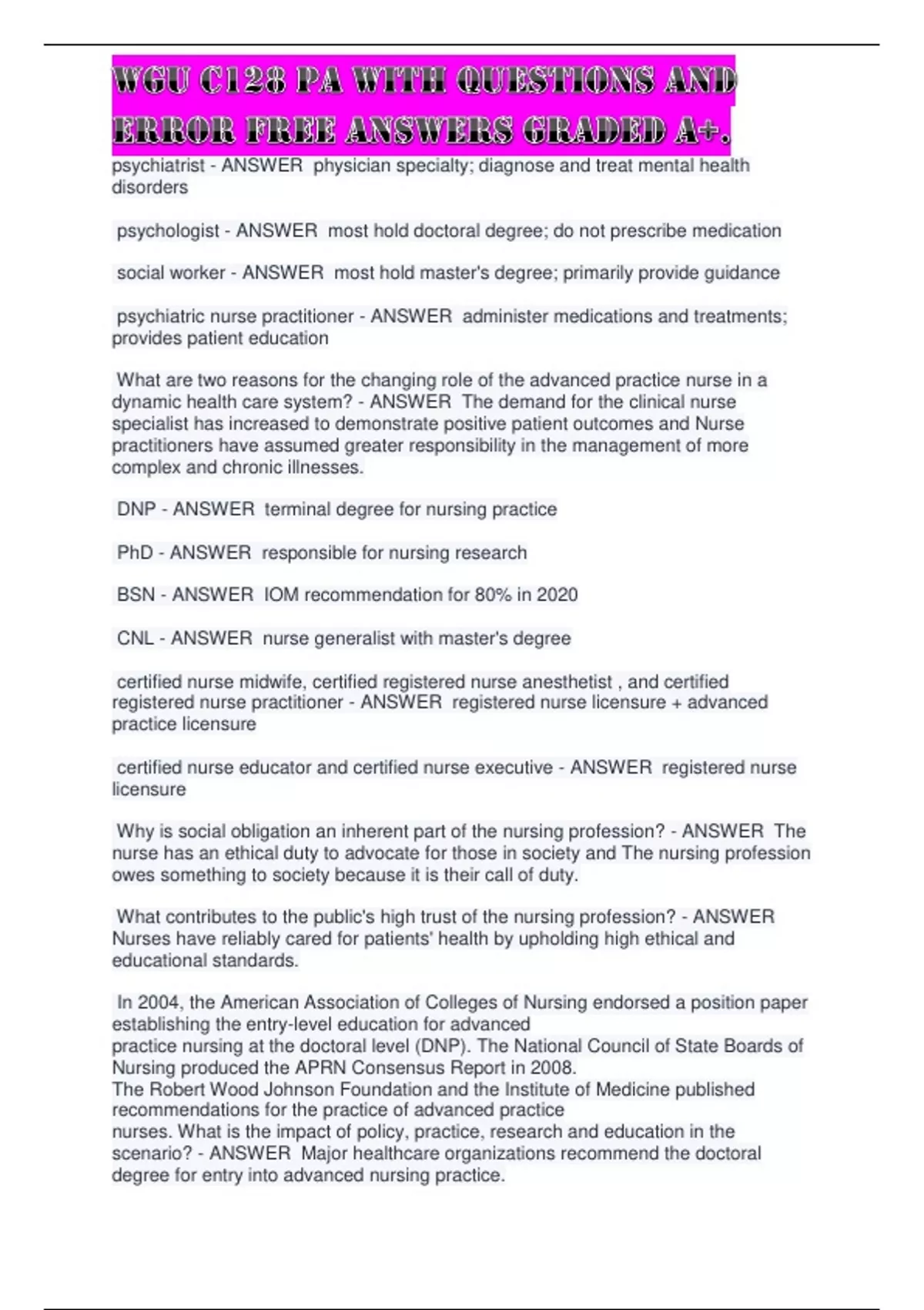 Why is social obligation an inherent part of the nursing profession? - ANSWER The nurse has an ethical duty to advocate for those in society and The nursing profession owes something to society because it is their call of duty. What contributes to the public's high trust of the nursing profession? - ANSWER Nurses have reliably cared for patients' health by upholding high ethical and educational standards. In 2004, the American Association of Colleges of Nursing endorsed a position paper establishing the entry-level education for advanced practice nursing at the doctoral level (DNP). The National Council of State Boards of Nursing produced the APRN Consensus Report in 2008. The Robert Wood Johnson Foundation and the Institute of Medicine published recommendations for the practice of advanced practice nurses. What is the impact of policy, practice, research and education in the scenario? - ANSWER Major healthcare organizations recommend the doctoral degree for entry into advanced nursing practice.