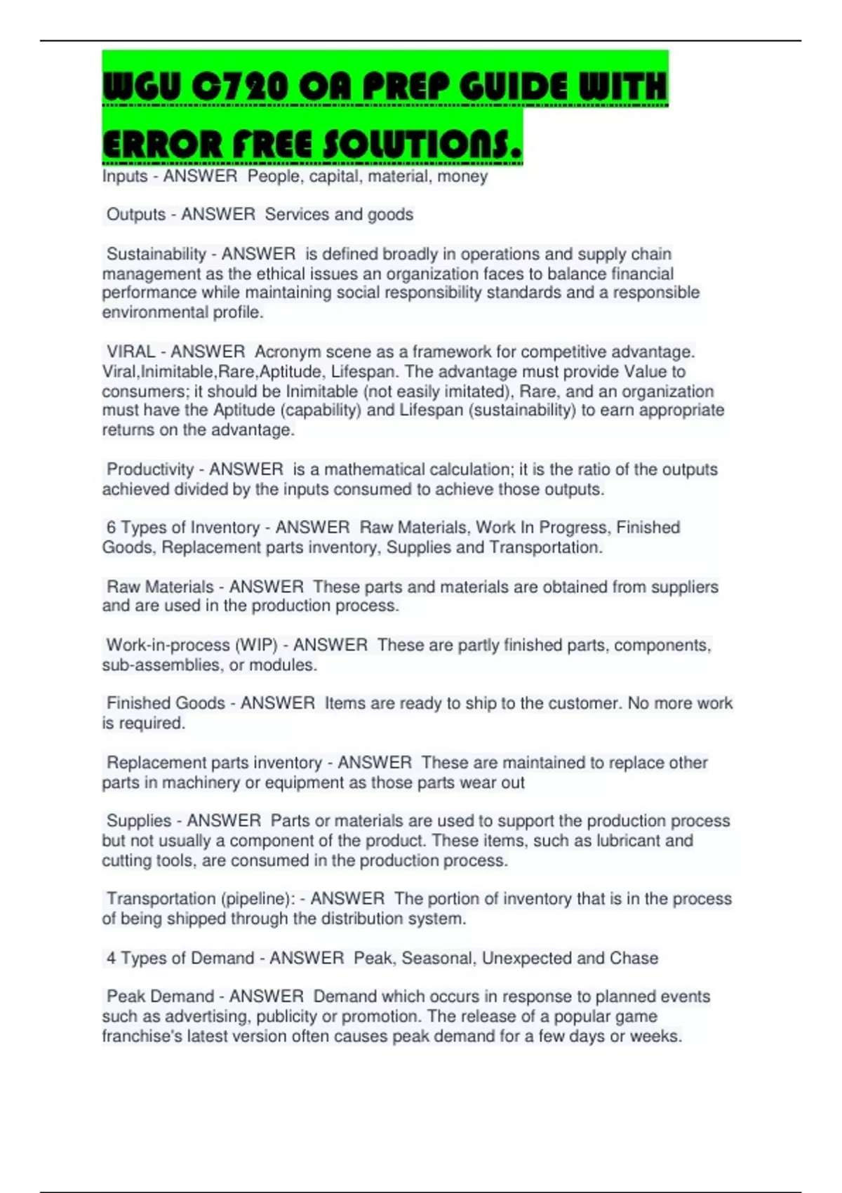 Inputs - ANSWER People, capital, material, money Outputs - ANSWER Services and goods Sustainability - ANSWER is defined broadly in operations and supply chain management as the ethical issues an organization faces to balance financial performance while maintaining social responsibility standards and a responsible environmental profile. VIRAL - ANSWER Acronym scene as a framework for competitive advantage. Viral,Inimitable,Rare,Aptitude, Lifespan. The advantage must provide Value to consumers; it should be Inimitable (not easily imitated), Rare, and an organization must have the Aptitude (capability) and Lifespan (sustainability) to earn appropriate returns on the advantage. Productivity - ANSWER is a mathematical calculation; it is the ratio of the outputs achieved divided by the inputs consumed to achieve those outputs. 6 Types of Inventory - ANSWER Raw Materials, Work In Progress, Finished Goods, Replacement parts inventory, Supplies and Transportation.