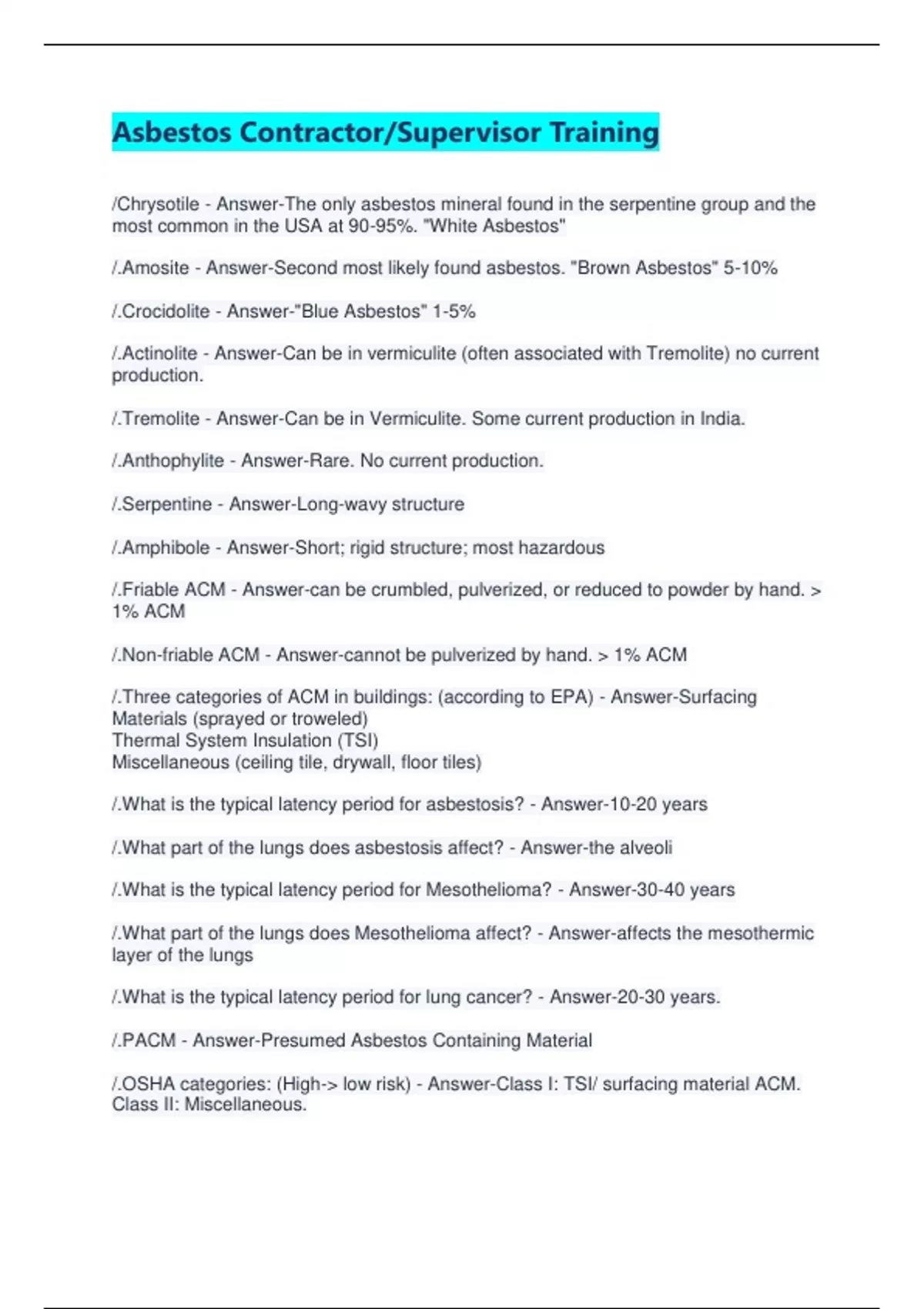 Asbestos Contractor/Supervisor Training /Chrysotile - Answer-The only asbestos mineral found in the serpentine group and the most common in the USA at 90-95%. "White Asbestos" /.Amosite - Answer-Second most likely found asbestos. "Brown Asbestos" 5-10% /.Crocidolite - Answer-"Blue Asbestos" 1-5% /.Actinolite - Answer-Can be in vermiculite (often associated with Tremolite) no current production. /.Tremolite - Answer-Can be in Vermiculite. Some current production in India. /.Anthophylite - Answer-Rare. No current production. /.Serpentine - Answer-Long-wavy structure /.Amphibole - Answer-Short; rigid structure; most hazardous /.Friable ACM - Answer-can be crumbled, pulverized, or reduced to powder by hand. > 1% ACM /.Non-friable ACM - Answer-cannot be pulverized by hand. > 1% ACM /.Three categories of ACM in buildings: (according to EPA) - Answer-Surfacing Materials (sprayed or troweled) Thermal System Insulation (TSI) Miscellaneous (ceiling tile, drywall, floor tiles) /.What is the typical latency period for asbestosis? - Answer-10-20 years /.What part of the lungs does asbestosis affect? - Answer-the alveoli /.What is the typical latency period for Mesothelioma? - Answer-30-40 years /.What part of the lungs does Mesothelioma affect? - Answer-affects the mesothermic layer of the lungs /.What is the typical latency period for lung cancer? - Answer-20-30 years. /.PACM - Answer-Presumed Asbestos Containing Material /.OSHA categories: (High-> low risk) - Answer-Class I: TSI/ surfacing material ACM. Class II: Miscellaneous. Class III: Operation and Maintenance. Class IV: Clean- up /.NESHAP - Answer-National Emission Standards for Hazardous Air Pollutants /.AHERA - Answer-Asbestos Hazard Emergency Response Act (specifically pertaining to SCHOOLS) /.When must you notify NESHAP of an asbestos related job? - Answer-Any project over 160 SF/260LF of RACM /.What is the Permissible Exposure Limit in the US. - Answer-PEL is required to be <0.1 f/cc. /.What are the two types of fit-tests? - Answer-Qualitative: Less comprehensive. With irritants. Quantitative: More comprehensive. With pressurization levels. /.How many layers of polyethylene must line the walls, ceilings, and floors? - Answer-2 layers of 6 mil. /.What must be done to the HVAC during an asbestos abatement project? - Answer-1) Turned off 2) Sealed 3) Control panel sealed, labeled and locked /.NESHAP classifications are: - Answer-Demolition- Removing 1+ load-bearing member Renovation- Altering facility w/o removing 1 load- bearing member Category I NF- "resilient flooring, asphalt roofing, gaskets, or packings." Category II NF- any non-friable not "" RACM- basically any currently or will become friable material. /.RACM - Answer-basically any currently or will become friable material. /.What are the four broad categories of respirators? - Answer-1) Air-purifying 2) Supplied-air 3) Self-contained breathing apparatus (SCBA) 4) Combination /.Supplied Air regulations - Answer-19.5-23.5% Oxygen 10 ppm carbon monoxide