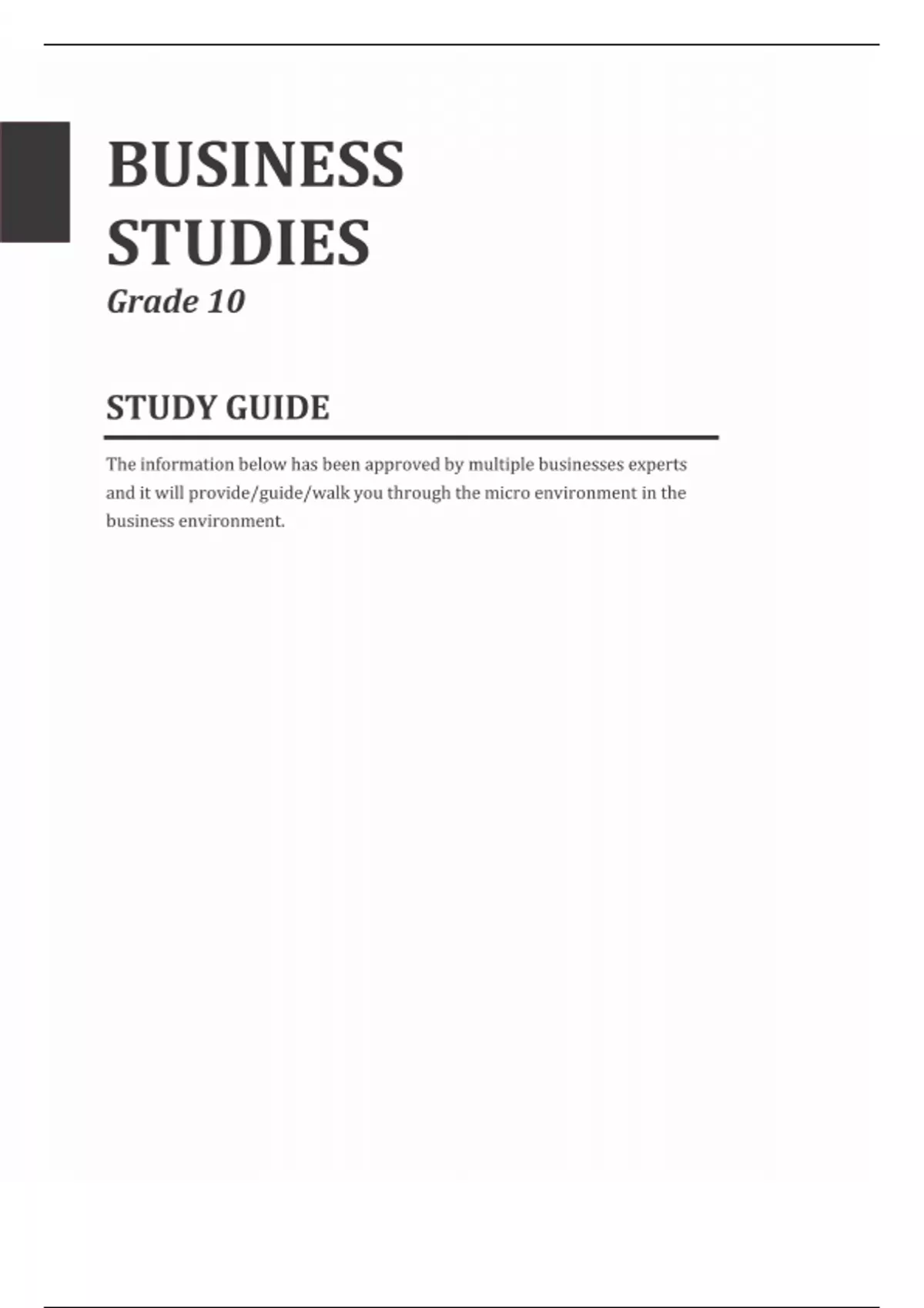 The information in this document is strictly linked to the micro environment in the business environments , grade 10 students can learn more about the micro business environment and it's basics, purchase and download to get the full understanding regarding micro business environment.