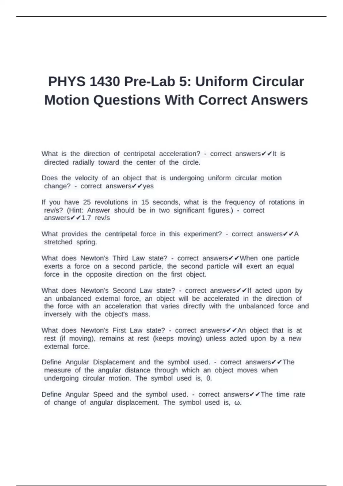 PHYS 1430 Pre-Lab 5: Uniform Circular Motion Questions With Correct Answers